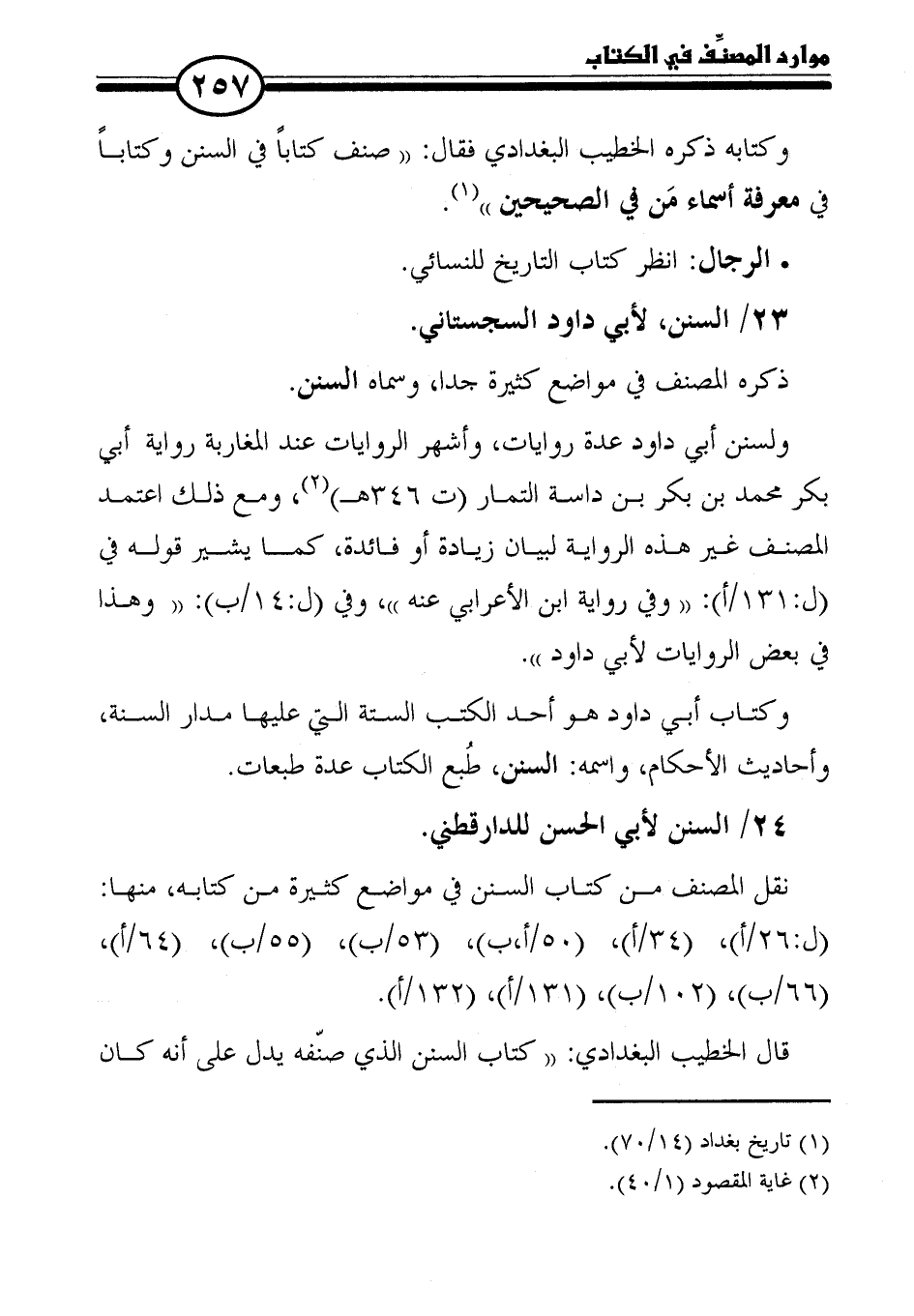 نقل المصنف من كتاب السنن في مواضع كثيرة من كتابه، منها: (ل: ٢٦/ أ)، (٣٤/ أ)، (٥٠/ أ، ب)، (٥٣/ ب)، (٥٥/ ب)، (٦٤/ أ)، (٦٦/ ب)، (١٠٢/ ب)، (١٣١/ أ)، (١٣٢/ أ).