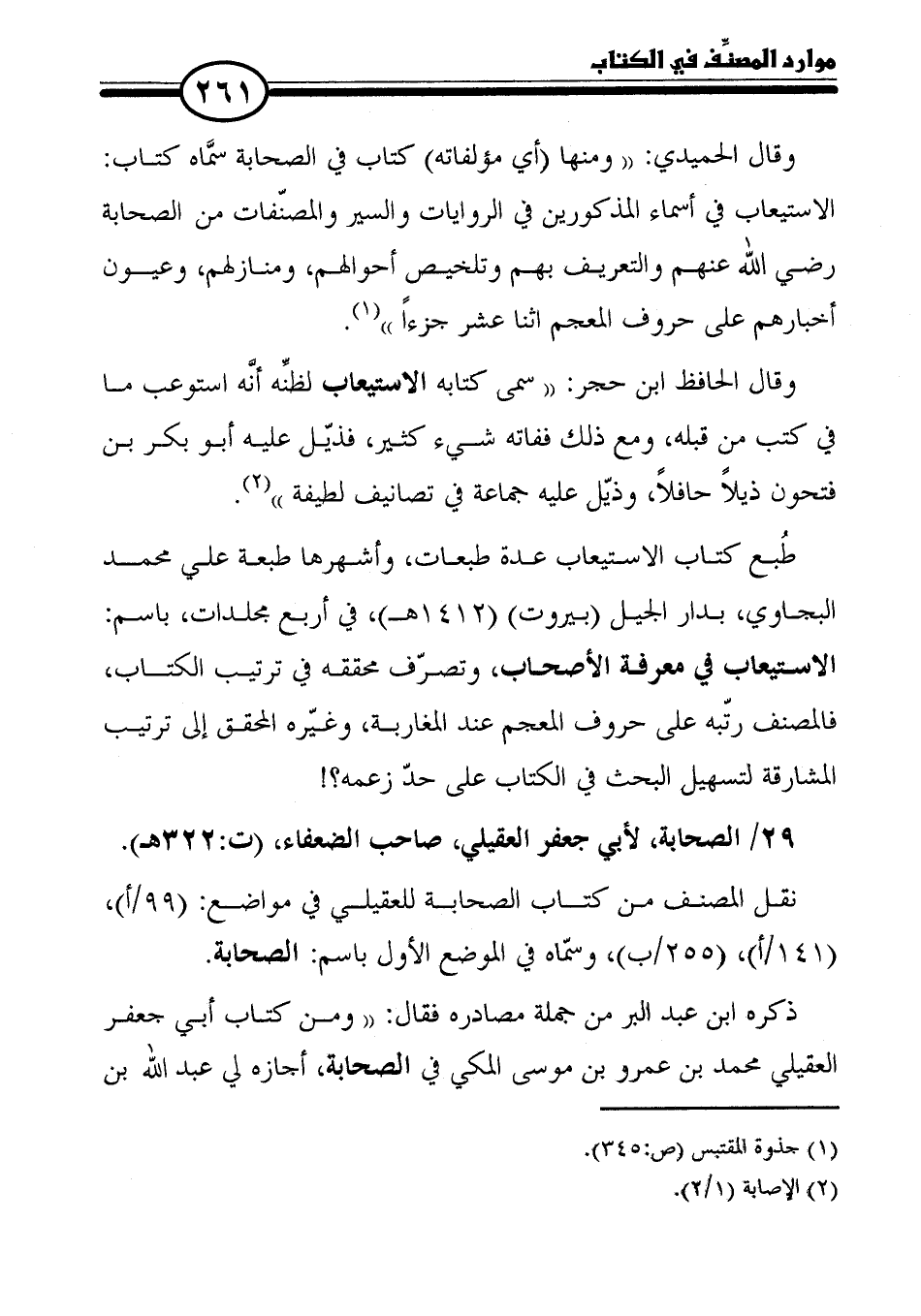 نقل المصنف من كتاب الصحابة للعقيلي في مواضع: (٩٩/ أ)، (١٤١/ أ)، (٢٥٥/ ب)، وسمّاه في الموضع الأول باسم: الصحابة.