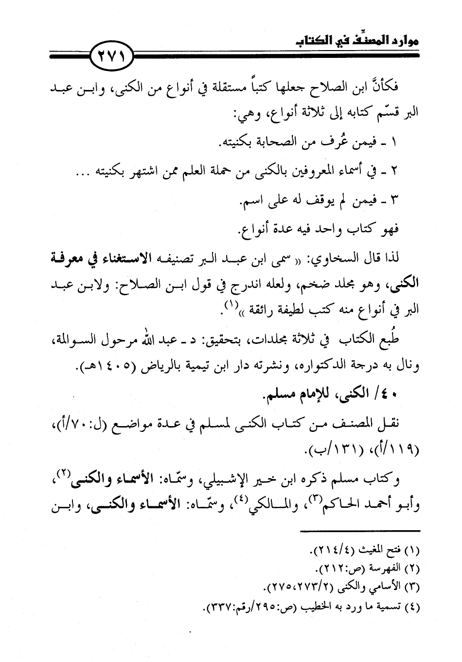فكأنَّ ابن الصلاح جعلها كتبًا مستقلة في أنواع من الكنى، وابن عبد البر قسّم كتابه إلى ثلاثة أنواع، وهي:
