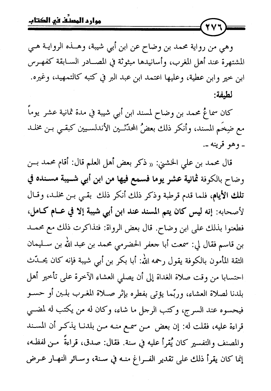 قال محمد بن علي الخشني: "ذكر بعض أهل العلم قال: أقام محمد بن وضاح بالكوفة ثمانية عشر يوما فسمع فيها من ابن أبي شيبة مسنده في تلك الأيام، فلما قدم قرطبة وذكر ذلك أنكر ذلك بقي بن مخلد، وقال لأصحابه: إنه ليس كان يتم المسند عند ابن أبي شيبة إلا في عام كامل، فطعنوا بذلك على ابن وضاح. قال بعض الرواة: فتذاكرت ذلك مع محمد بن قاسم فقال لي: سمعت أبا جعفر الحضرمي محمد بن عبد الله بن سليمان الثقة المأمون بالكوفة يقول رحمه الله: أبا بكر ين أبي شيبة فإنه كان يحدّث احتسابا من وقت صلاة الغداة إلى أن يصلي العشاء الآخرة على تأخير أهل بلدنا لصلاة العشاء، وربّما يؤتى بفطره بإثر صلاة المغرب بلبن أو حسو فيحسوه عند السرج، وكتب الرجل ما شاء، وكان له من يكتب له لمضي قراءة عليه، فقلت له: إن بعض من سمع منه من بلدنا يذكر أن المسند والمصنف والتفسير كان يُقرأ عليه له سنة. فقال: صدق، قراءةً من لفظه، إنما كان يقرأ ذلك على تقدير الفراغ منه في سنة، وسائر النهار عرض
