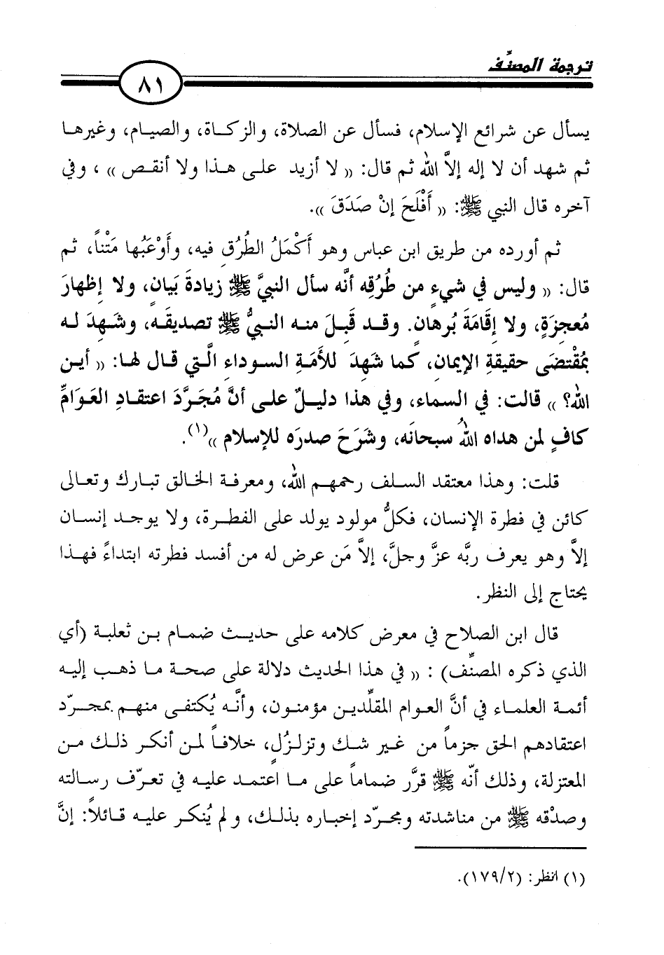 قال ابن الصلاح في معرض كلامه على حديث ضمام بن ثعلبة (أي الذي ذكره المصنِّف): "في هذا الحديث دلالة على صحة ما ذهب إليه أئمة العلماء في أنَّ العوام المقلِّدين مؤمنون، وأنَّه يُكتفى منهم بمجرّد اعتقادهم الحق جزمًا من غير شك وتزلزُلٍ، خلافًا لمن أنكر ذلك من المعتزلة، وذلك أنّه - صلى الله عليه وسلم - قرَّر ضمامًا على ما اعتمد عليه في تعرّف رسالته وصدْقه - صلى الله عليه وسلم - من مناشدته ومجرّد إخباره بذلك، ولم يُنكر عليه قائلًا: إنَّ