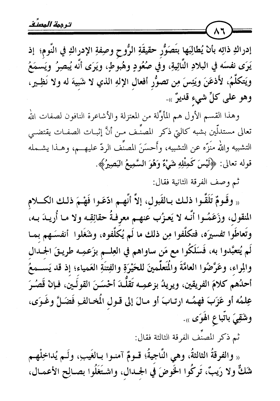 "والفرقةُ الثالثةُ، وهي النَّاجيةُ؛ قومٌ آمنوا بالغَيبِ، ولَم يُداخِلْهم شَكٌّ ولا رَيبٌ، تَركُوا الخَوضَ في الجِدالِ، واشتَغَلُوا بصالِح الأعمال،