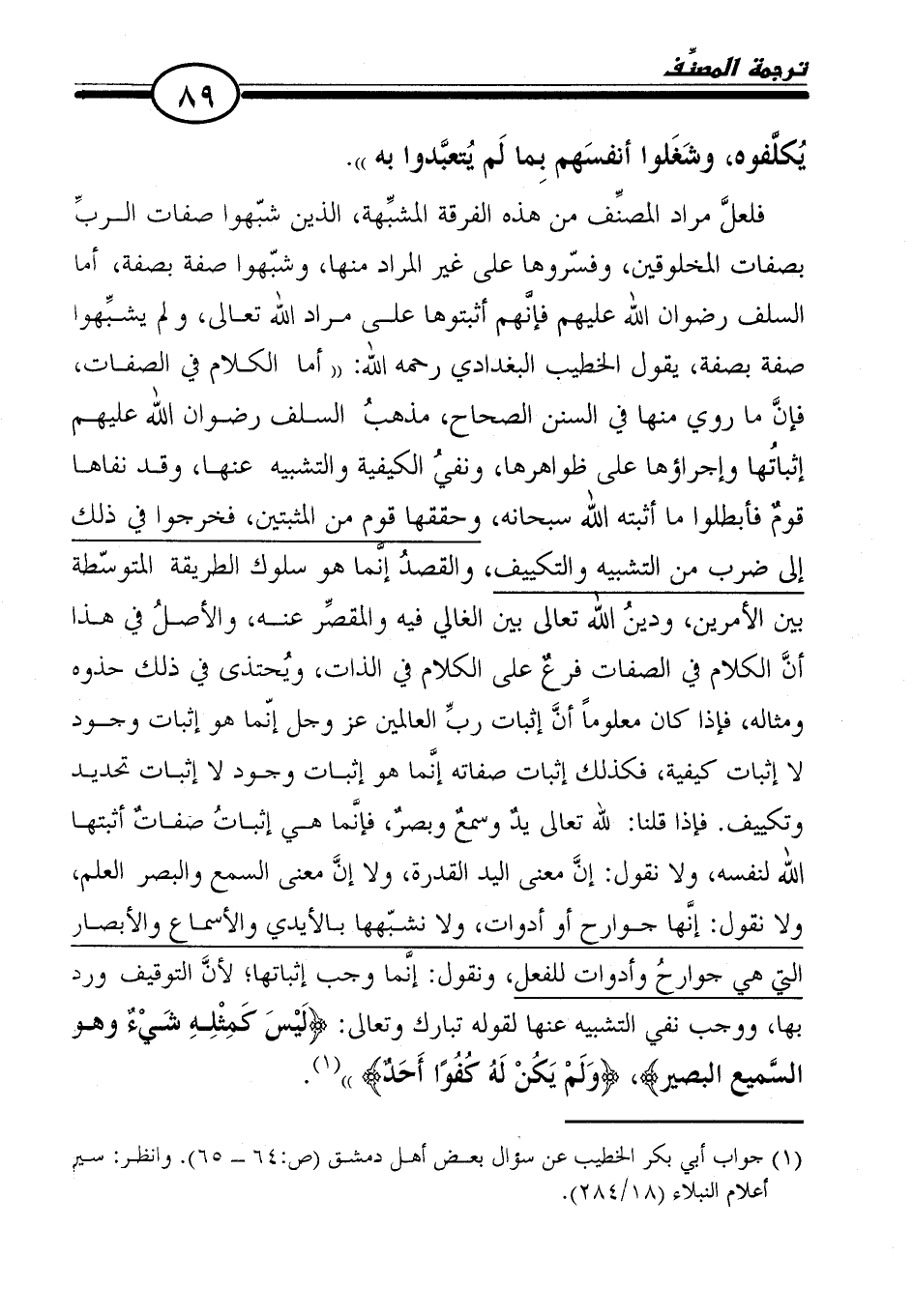 فلعلَّ مراد المصنِّف من هذه الفرقة المشبِّهة، الذين شبّهوا صفات الربِّ بصفات المخلوقين، وفسّروها على غير المراد منها، وشبّهوا صفة بصفة، أما السلف رضوان الله عليهم فإنهم أثبتوها على مراد الله تعالى، ولم يشبِّهوا صفة بصفة، يقول الخطيب البغدادي رحمه الله: "أما الكلام في الصفات، فإنَّ ما روي منها في السنن الصحاح، مذهبُ السلف رضوان الله عليهم إثباتها وإجراؤها على ظواهرها، ونفيُ الكيفية والتشبيه عنها، وقد نفاها قوم فأبطلوا ما أثبته الله سبحانه، وحققها قوم من المثبتين، فخرجوا في ذلك إلى ضرب من التشبيه والتكييف، والقصدُ إنما هو سلوك الطريقة المتوسّطة بين الأمرين، ودينُ الله تعالى بين الغالي فيه والمقصِّر عنه، والأصلُ في هذا أنَّ الكلام في الصفات فرعٌ على الكلام في الذات، ويُحتذى في ذلك حذوه ومثاله، فإذا كان معلومًا أنَّ إثبات ربِّ العالمين عز وجل إنّما هو إثبات وجود لا إثبات كيفية، فكذلك إثبات صفاته إنَّما هو إثبات وجود لا إثبات تحديد وتكييف. فإذا قلنا: لله تعالى يدٌ وسمعٌ وبصرٌ، فإنَّما هي إثباتُ صفاتٌ أثبتها الله لنفسه، ولا نقول: إنَّ معنى اليد القدرة، ولا إنَّ معنى السمع والبصر العلم، ولا نقول: إنَّها جوارح أو أدوات، ولا نشبّهها بالأيدي والأسماع والأبصار التي هي جوارحُ وأدوات للفعل، ونقول: إنَّما وجب إثباتها؛ لأنَّ التوقيف ورد بها، ووجب نفي التشبيه عنها لقوله تبارك وتعالى: {لَيْسَ كَمِثْلِهِ شَيْءٌ وَهُوَ السَّمِيعُ الْبَصِيرُ} , {وَلَمْ يَكُنْ لَهُ كُفُوًا أَحَدٌ (٤)} (١).