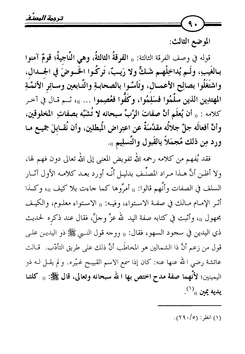 قوله في وصف الفرقة الثالثة: "الفرقةُ الثالثةُ، وهي النَّاجِيةُ؛ قومٌ آمنوا بالغَيبِ، ولَم يُداخِلْهم شَكّ ولا رَيبٌ، تَركُوا الخَوضَ في الجِدالِ، واشتَغَلُوا بصالح الأعمالِ، وتَأسَّوا بالصحابةِ والتَّابعين وسائِرِ الأئمَّة المهتدِين الذين سلَّمُوا فسَلِمُوا، وكَفُّوا فعُصِموا ... "، ثم قال في آخر كلامه: "أن يُعلَم أنَ صفاتَ الرَّبِّ سبحانه لا تُشَبَّه بصفاتِ المخلوقين، وأنَّ أفعالَه جلَّ جلالُه مقدَّسَةٌ عن اعتِراض المُبطلين، وأن نُقابِلَ جميع ما ورد مِن ذلك مُجمَلًا بالقَبول والتَّسلِيمِ".