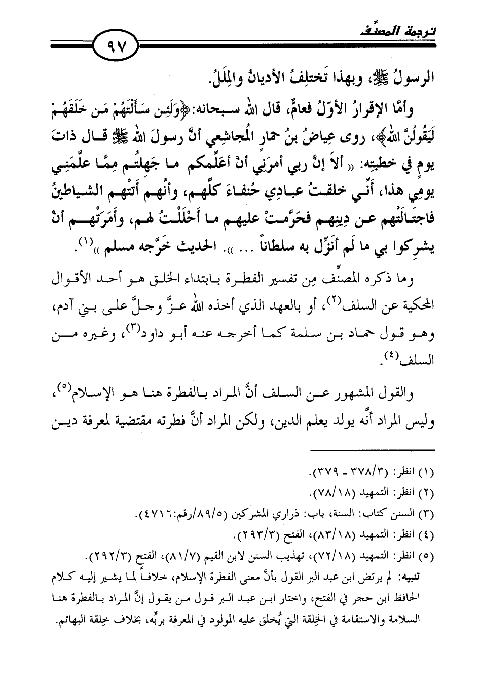 والقول المشهور عن السلف أنَّ المراد بالفطرة هنا هو الإسلام (٥)، وليس المراد أنَّه يولد يعلم الدين، ولكن المراد أنَّ فطرته مقتضية لمعرفة دين