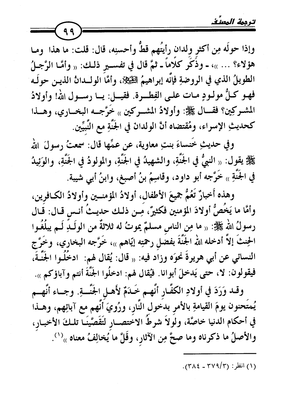 وهذه أَخبارٌ تَعُمُّ جميعَ الأطفالِ، أولادُ المؤمنين وأولادُ الكافرِين، وأمَّا ما يَخُصُّ أولادَ المؤمنين فكثيرٌ، مِن ذلك حديثُ أنسٍ قال: قال رسولُ الله - صلى الله عليه وسلم -: "ما مِن الناسِ مسلمٌ يموتُ له ثلاثةٌ من الولَدِ لَم يبلُغُوا الحِنثَ إلَّا أدخله الله الجَنَّةَ بفضلِ رحمتِه إيّاهم"، خَرَّجه البخاري، وخَرَّج النسائي عن أبي هريرةَ نحوَه وزاد فيه: "قال: يُقال لهم: ادخُلُوا الجَنَّةَ، فيقولون: لا، حتى يَدخلَ أبوانا. فيُقال لهم: ادخلُوا الجَنّةَ أنتم وآباؤكم".