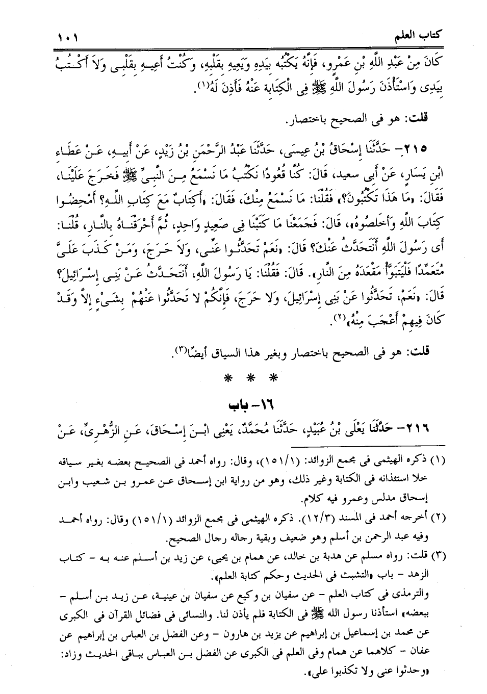 215 - حَدَّثَنَا إِسْحَاقُ بْنُ عِيسَى، حَدَّثَنَا عَبْدُ الرَّحْمَنِ بْنُ زَيْدٍ، عَنْ أَبِيهِ، عَنْ عَطَاءِ ابْنِ يَسَارٍ، عَنْ أَبِى سعيد، قَالَ: كُنَّا قُعُودًا نَكْتُبُ مَا نَسْمَعُ مِنَ النَّبِىِّ صلى الله عليه وسلم فَخَرَجَ عَلَيْنَا، فَقَالَ: "مَا هَذَا تَكْتُبُونَ؟ فَقُلْنَا: مَا نَسْمَعُ مِنْكَ، فَقَالَ: "أَكِتَابٌ مَعَ كِتَابِ اللَّهِ؟ أَمْحِضُوا كِتَابَ اللَّهِ وَأخَلصُوهُ، قَالَ: فَجَمَعْنَا مَا كَتَبْنَا فِى صَعِيدٍ وَاحِدٍ، ثُمَّ أَحْرَقْنَاهُ بِالنَّارِ، قُلْنَا: أَى رَسُولَ اللَّهِ أَنَتَحَدَّثُ عَنْكَ؟ قَالَ: "نَعَمْ تَحَدَّثُوا عَنِّى، وَلاَ حَرَجَ، وَمَنْ كَذَبَ عَلَىَّ مُتَعَمِّدًا فَلْيَتَبَوَّأْ مَقْعَدَهُ مِنَ النَّارِ. قَالَ: فَقُلْنَا: يَا رَسُولَ اللَّهِ، أَنَتَحَدَّثُ عَنْ بَنِى إِسْرَائِيلَ؟ قَالَ: "نَعَمْ، تَحَدَّثُوا عَنْ بَنِى إِسْرَائِيلَ، وَلا حَرَجَ، فَإِنَّكُمْ لا تَحَدَّثُوا عَنْهُمْ بِشَىْءٍ إِلاَّ وَقَدْ كَانَ فِيهِمْ أَعْجَبَ مِنْهُ.