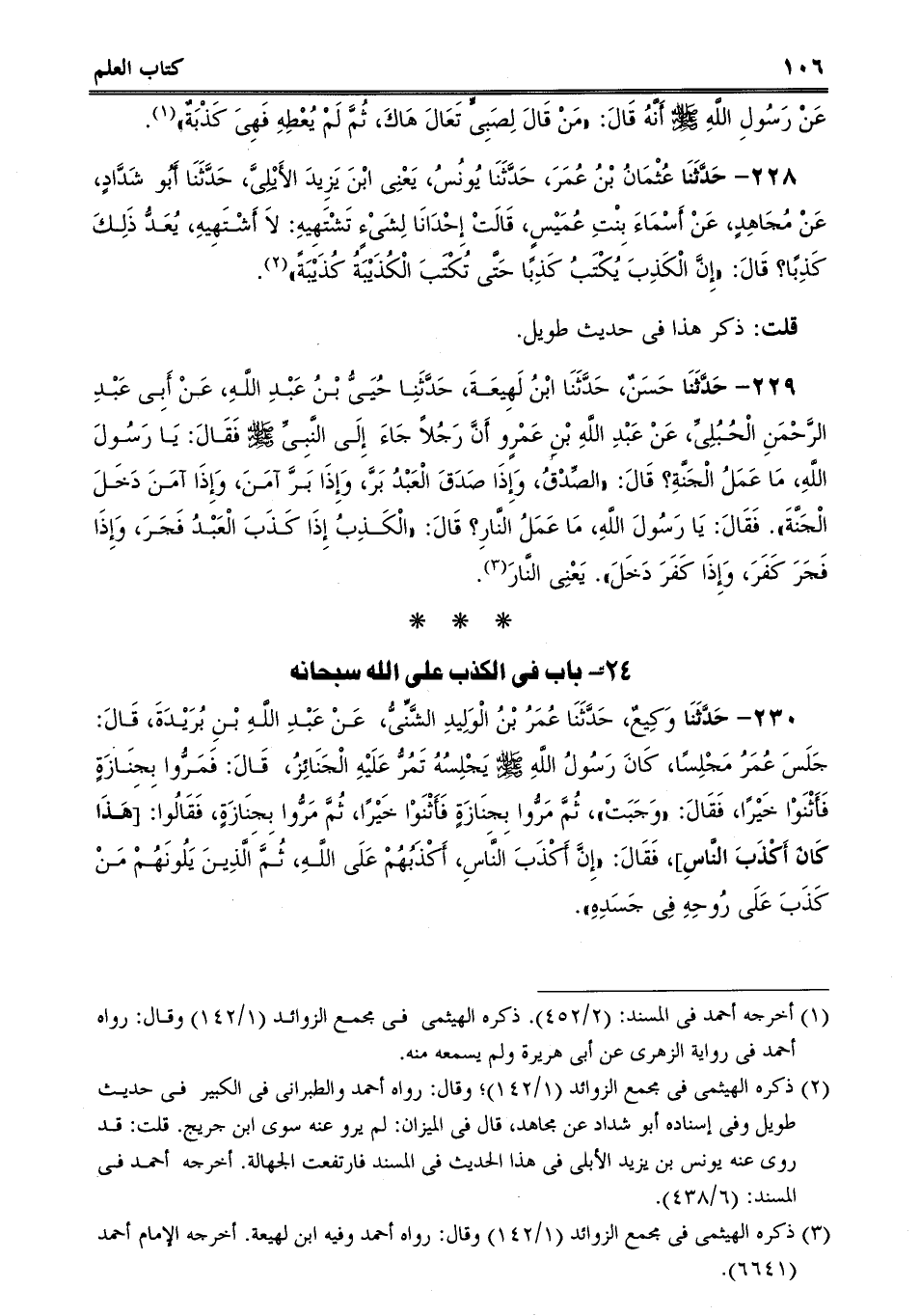 228 - حَدَّثَنَا عُثْمَانُ بْنُ عُمَرَ، حَدَّثَنَا يُونُسُ، يَعْنِى ابْنَ يَزِيدَ الأَيْلِىَّ، حَدَّثَنَا أَبُو شَدَّادٍ، عَنْ مُجَاهِدٍ، عَنْ أَسْمَاءَ بِنْتِ عُمَيْسٍ، قَالَتْ إِحْدَانَا لِشَىْءٍ تَشْتَهِيهِ: لاَ أَشْتَهِيهِ، يُعَدُّ ذَلِكَ كَذِبًا؟ قَالَ: "إِنَّ الْكَذِبَ يُكْتَبُ كَذِبًا حَتَّى تُكْتَبَ الْكُذَيْبَةُ كُذَيْبَةً.