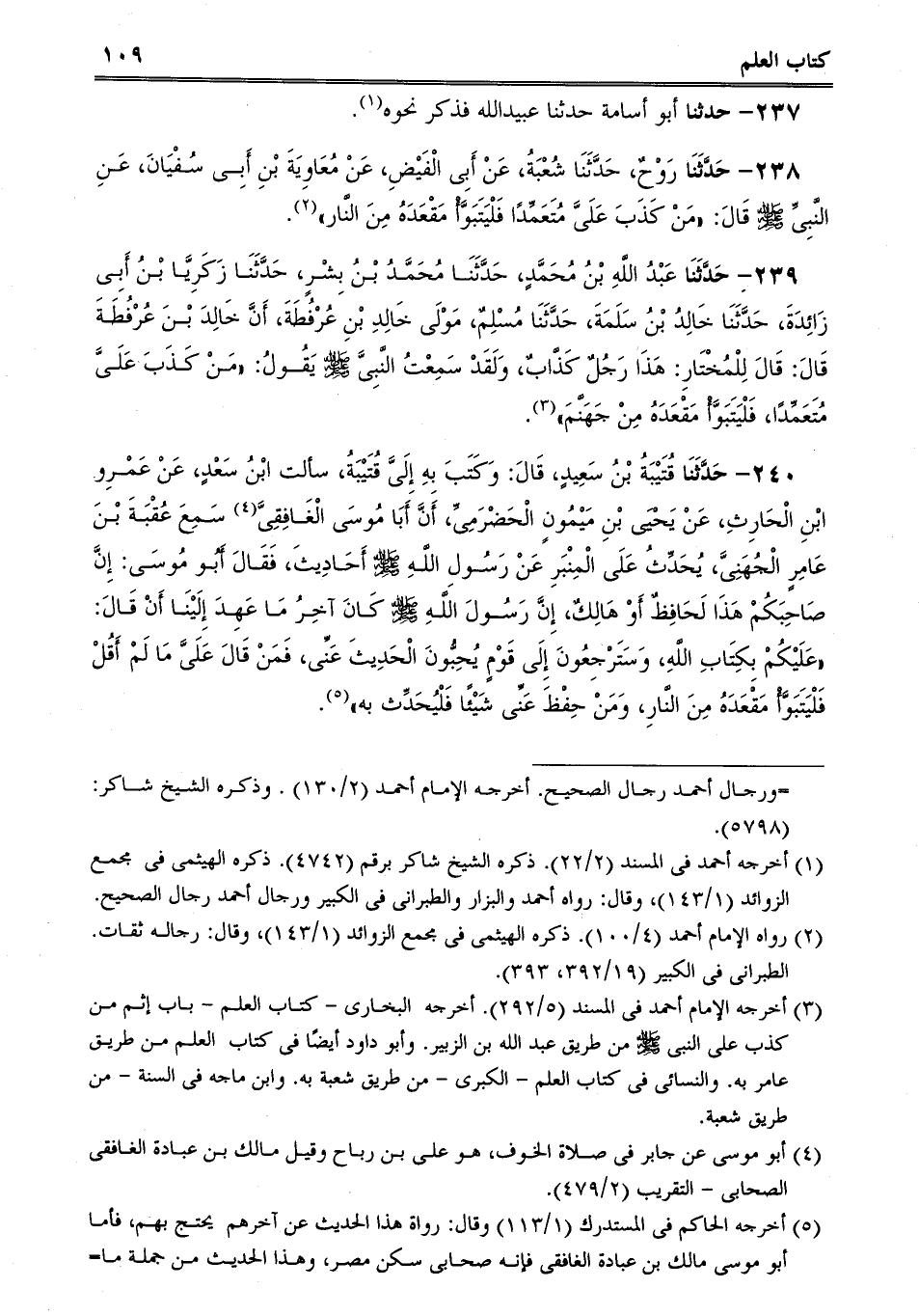 238 - حَدَّثَنَا رَوْحٌ، حَدَّثَنَا شُعْبَةُ، عَنْ أَبِى الْفَيْضِ، عَنْ مُعَاوِيَةَ بْنِ أَبِى سُفْيَانَ، عَنِ النَّبِىِّ صلى الله عليه وسلم قَالَ: "مَنْ كَذَبَ عَلَىَّ مُتَعَمِّدًا فَلْيَتَبَوَّأْ مَقْعَدَهُ مِنَ النَّار.