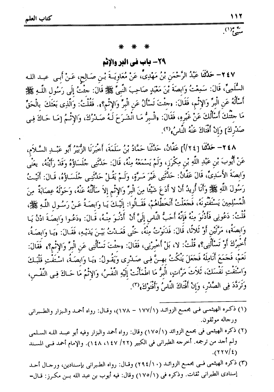 247 - حَدَّثَنَا عَبْدُ الرَّحْمَنِ بْنُ مَهْدِىٍّ، عَنْ مُعَاوِيَةَ بْنِ صَالِحٍ، عَنْ أَبِى عبد الله السُّلَمِىِّ، قَالَ: سَمِعْتُ وَابِصَةَ بْنَ مَعْبَدٍ صَاحِبَ النَّبِىِّ صلى الله عليه وسلم قَالَ: جِئْتُ إِلَى رَسُولِ اللَّهِ صلى الله عليه وسلم أَسْأَلُهُ عَنِ الْبِرِّ وَالإِثْمِ، فَقَالَ: "جِئْتَ تَسْأَلُ عَنِ الْبِرِّ وَالإِثْمِ؟. فَقُلْتُ: وَالَّذِى بَعَثَكَ بِالْحَقِّ مَا جِئْتُكَ أَسْأَلُكَ عَنْ غَيْرِهِ، فَقَالَ: "الْبِرُّ مَا انْشَرَحَ لَهُ صَدْرُكَ، وَالإِثْمُ [مَا حَاكَ فِى صَدْرِكَ] وَإِنْ أَفْتَاكَ عَنْهُ النَّاسُ.