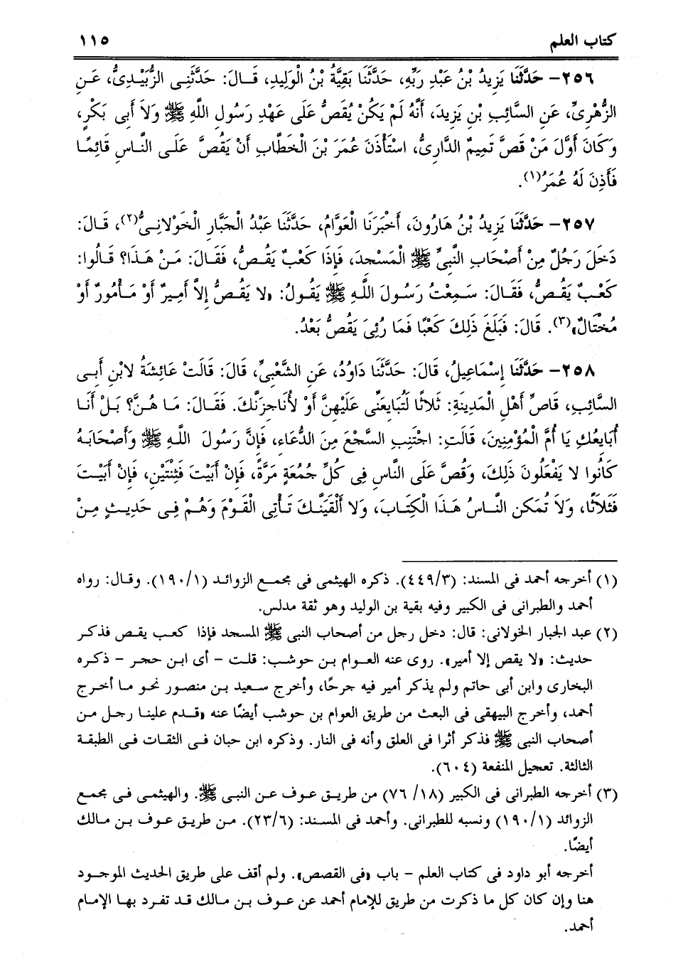 257 - حَدَّثَنَا يَزِيدُ بْنُ هَارُونَ، أَخْبَرَنَا الْعَوَّامُ، حَدَّثَنَا عَبْدُ الْجَبَّارِ الْخَوْلانِىُّ، قَالَ: دَخَلَ رَجُلٌ مِنْ أَصْحَابِ النَّبِىِّ صلى الله عليه وسلم الْمَسْجِدَ، فَإِذَا كَعْبٌ يَقُصُّ، فَقَالَ: مَنْ هَذَا؟ قَالُوا: كَعْبٌ يَقُصُّ، فَقَالَ: سَمِعْتُ رَسُولَ اللَّهِ صلى الله عليه وسلم يَقُولُ: "لا يَقُصُّ إِلاَّ أَمِيرٌ أَوْ مَأْمُورٌ أَوْ مُخْتَالٌ. قَالَ: فَبَلَغَ ذَلِكَ كَعْبًا فَمَا رُئِىَ يَقُصُّ بَعْدُ.