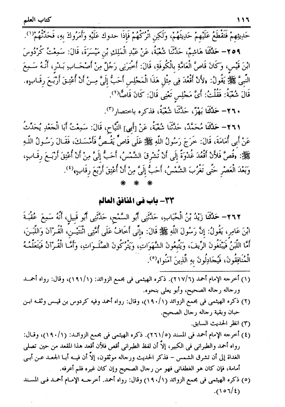 259 - حَدَّثَنَا هَاشِمٌ، حَدَّثَنَا شُعْبَةُ، عَنْ عَبْدِ الْمَلِكِ بْنِ مَيْسَرَةَ، قَالَ: سَمِعْتُ كُرْدُوسَ ابْنَ قَيْسٍ، وَكَانَ قَاصَّ الْعَامَّةِ بِالْكُوفَةِ، قَالَ: أَخْبَرَنِى رَجُلٌ مِنْ أَصْحَابِ بَدْرٍ، أَنَّهُ سَمِعَ النَّبِىَّ صلى الله عليه وسلم يَقُولُ: "لأَنْ أَقْعُدَ فِى مِثْلِ هَذَا الْمَجْلِسِ أَحَبُّ إِلَىَّ مِنْ أَنْ أُعْتِقَ أَرْبَعَ رِقَابٍ. قَالَ شُعْبَةُ: فَقُلْتُ: أَىَّ مَجْلِسٍ تَعْنِى قَالَ: كَانَ قَاصًّا.