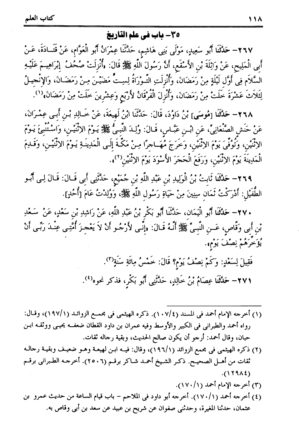 268 - حَدَّثَنَا [مُوسَى] بْنُ دَاوُدَ، قَالَ: حَدَّثَنَا ابْنُ لَهِيعَةَ، عَنْ خَالِدِ بْنِ أَبِى عِمْرَانَ، عَنْ حَنَشٍ الصَّنْعَانِىِّ، عَنِ ابْنِ عَبَّاسٍ، قَالَ: وُلِدَ النَّبِىُّ صلى الله عليه وسلم يَوْمَ الاِثْنَيْنِ، وَاسْتُنْبِئَ يَوْمَ الاِثْنَيْنِ، وَتُوُفِّىَ يَوْمَ الاِثْنَيْنِ، وَخَرَجَ مُهَاجِرًا مِنْ مَكَّةَ إِلَى الْمَدِينَةِ يَوْمَ الاِثْنَيْنِ، وَقَدِمَ الْمَدِينَةَ يَوْمَ الاِثْنَيْنِ، وَرَفَعَ الْحَجَرَ الأَسْوَدَ يَوْمَ الاِثْنَيْنِ.