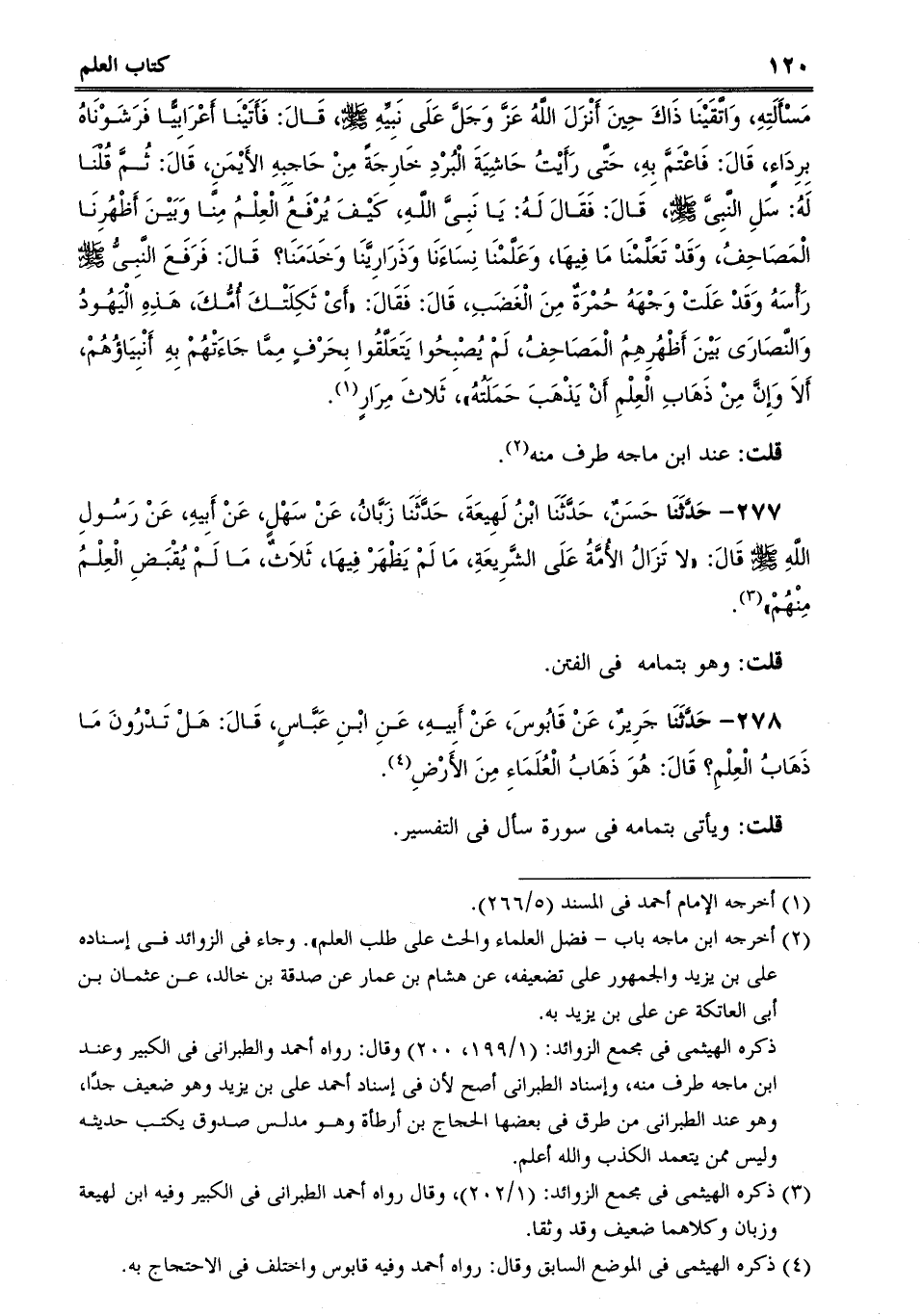 278 - حَدَّثَنَا جَرِيرٌ، عَنْ قَابُوسَ، عَنْ أَبِيهِ، عَنِ ابْنِ عَبَّاسٍ، قَالَ: هَلْ تَدْرُونَ مَا ذَهَابُ الْعِلْمِ؟ قَالَ: هُوَ ذَهَابُ الْعُلَمَاءِ مِنَ الأَرْضِ.