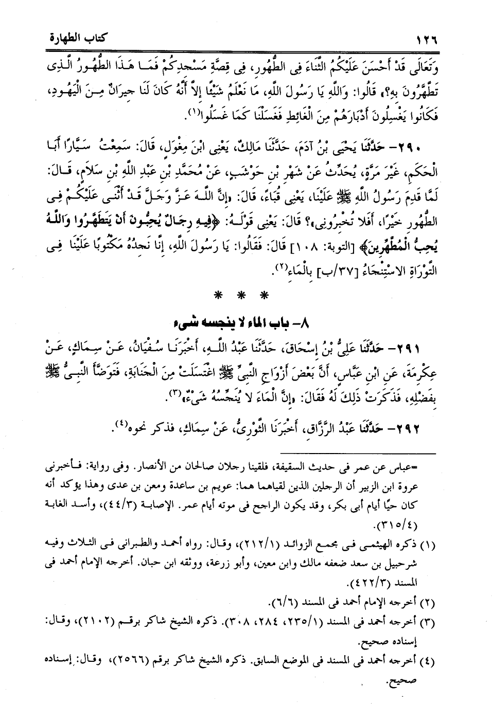 290 - حَدَّثَنَا يَحْيَى بْنُ آدَمَ، حَدَّثَنَا مَالِكٌ، يَعْنِى ابْنَ مِغْوَلٍ، قَالَ: سَمِعْتُ سَيَّارًا أَبَا الْحَكَمِ، غَيْرَ مَرَّةٍ، يُحَدِّثُ عَنْ شَهْرِ بْنِ حَوْشَبٍ، عَنْ مُحَمَّدِ بْنِ عَبْدِ اللَّهِ بْنِ سَلاَمٍ، قَالَ: لَمَّا قَدِمَ رَسُولُ اللَّهِ صلى الله عليه وسلم عَلَيْنَا، يَعْنِى قُبَاءً، قَالَ: "إِنَّ اللَّهَ عَزَّ وَجَلَّ قَدْ أَثْنَى عَلَيْكُمْ فِى الطُّهُورِ خَيْرًا، أَفَلا تُخْبِرُونِى؟ قَالَ: يَعْنِى قَوْلَهُ: {فِيهِ رِجَالٌ يُحِبُّونَ أَنْ يَتَطَهَّرُوا وَاللَّهُ يُحِبُّ الْمُطَّهِّرِينَ} قَالَ: فَقَالُوا: يَا رَسُولَ اللَّهِ، إِنَّا نَجِدُهُ مَكْتُوبًا عَلَيْنَا فِى التَّوْرَاةِ الاسْتِنْجَاءُ بِالْمَاءِ.