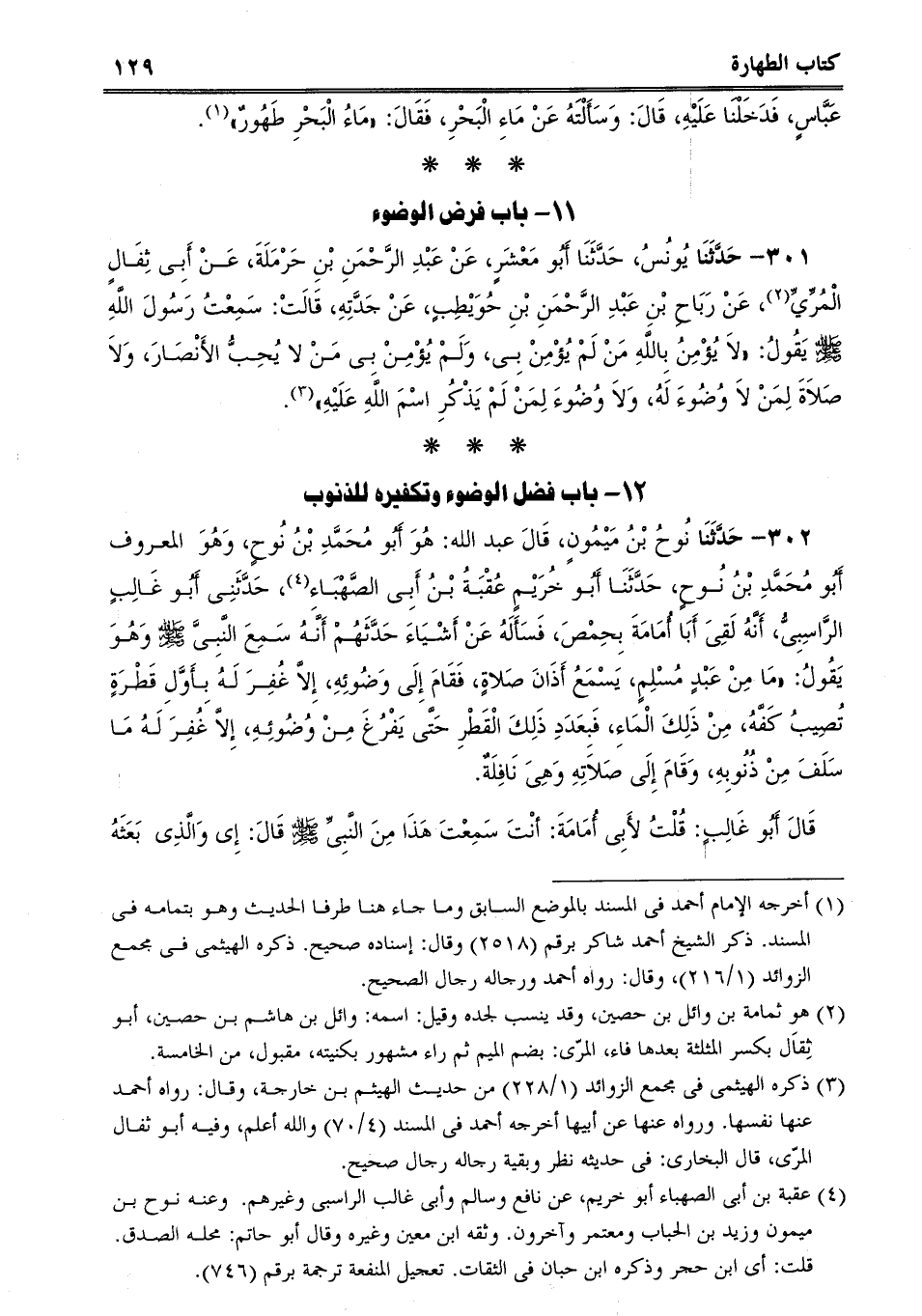 302 - حَدَّثَنَا نُوحُ بْنُ مَيْمُونٍ، قَالَ عبد الله: هُوَ أَبُو مُحَمَّدِ بْنُ نُوحٍ، وَهُوَ المعروف أَبُو مُحَمَّدِ بْنُ نُوحٍ، حَدَّثَنَا أَبُو خُرَيْمٍ عُقْبَةُ بْنُ أَبِى الصَّهْبَاءِ، حَدَّثَنِى أَبُو غَالِبٍ الرَّاسِبِىُّ، أَنَّهُ لَقِىَ أَبَا أُمَامَةَ بِحِمْصَ، فَسَأَلَهُ عَنْ أَشْيَاءَ حَدَّثَهُمْ أَنَّهُ سَمِعَ النَّبِىَّ صلى الله عليه وسلم وَهُوَ يَقُولُ: "مَا مِنْ عَبْدٍ مُسْلِمٍ، يَسْمَعُ أَذَانَ صَلاةٍ، فَقَامَ إِلَى وَضُوئِهِ، إِلاَّ غُفِرَ لَهُ بِأَوَّلِ قَطْرَةٍ تُصِيبُ كَفَّهُ، مِنْ ذَلِكَ الْمَاءِ، فَبِعَدَدِ ذَلِكَ الْقَطْرِ حَتَّى يَفْرُغَ مِنْ وُضُوئِهِ، إِلاَّ غُفِرَ لَهُ مَا سَلَفَ مِنْ ذُنُوبِهِ، وَقَامَ إِلَى صَلاَتِهِ وَهِىَ نَافِلَةٌ.