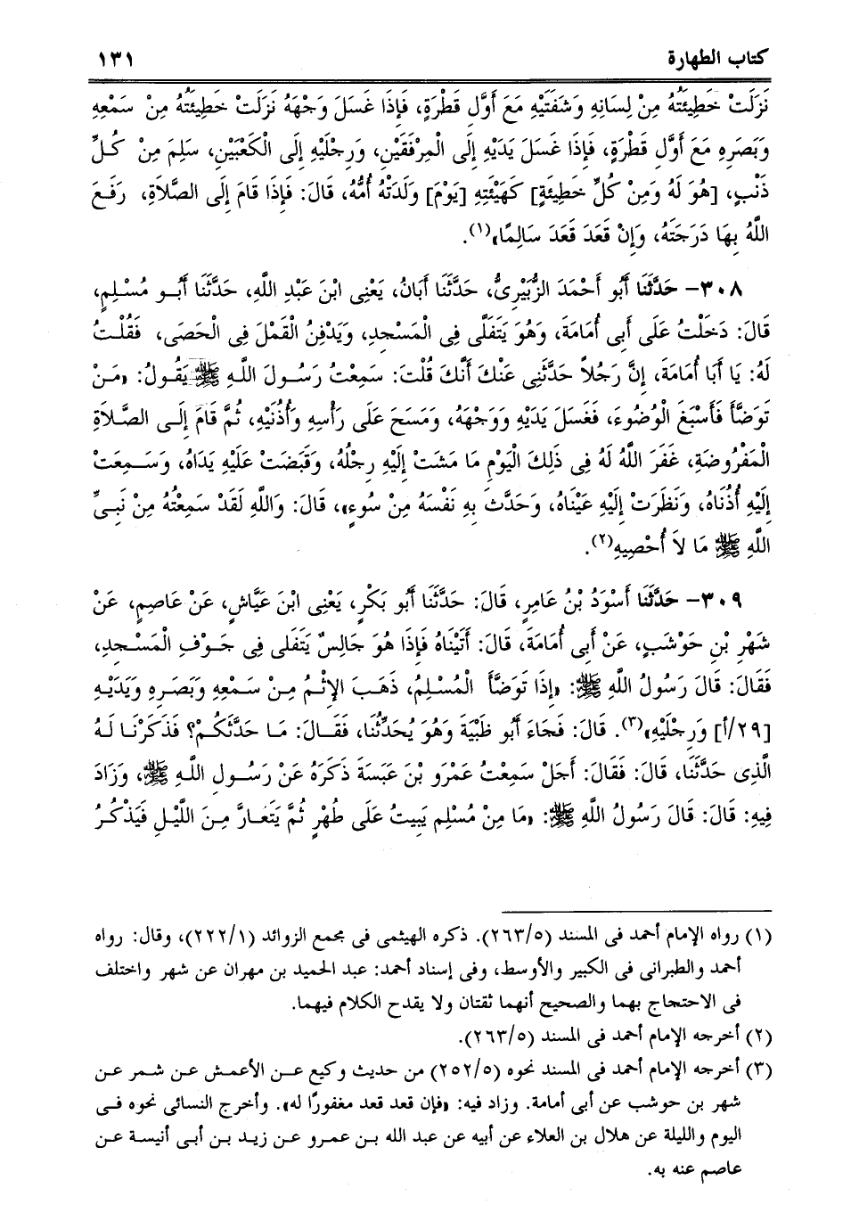 309 - حَدَّثَنَا أَسْوَدُ بْنُ عَامِرٍ، قَالَ: حَدَّثَنَا أَبُو بَكْرٍ، يَعْنِى ابْنَ عَيَّاشٍ، عَنْ عَاصِمٍ، عَنْ شَهْرِ بْنِ حَوْشَبٍ، عَنْ أَبِى أُمَامَةَ، قَالَ: أَتَيْنَاهُ فَإِذَا هُوَ جَالِسٌ يَتَفَلى فِى جَوْفِ الْمَسْجِدِ، فَقَالَ: قَالَ رَسُولُ اللَّهِ صلى الله عليه وسلم: "إِذَا تَوَضَّأَ الْمُسْلِمُ، ذَهَبَ الإِثْمُ مِنْ سَمْعِهِ وَبَصَرِهِ وَيَدَيْهِ وَرِجْلَيْهِ. قَالَ: فَجَاءَ أَبُو ظَبْيَةَ وَهُوَ يُحَدِّثُنَا، فَقَالَ: مَا حَدَّثَكُمْ؟ فَذَكَرْنَا لَهُ الَّذِى حَدَّثَنَا، قَالَ: فَقَالَ: أَجَلْ سَمِعْتُ عَمْرَو بْنَ عَبَسَةَ ذَكَرَهُ عَنْ رَسُولِ اللَّهِ صلى الله عليه وسلم، وَزَادَ فِيهِ: قَالَ: قَالَ رَسُولُ اللَّهِ صلى الله عليه وسلم: "مَا مِنْ مُسْلِم يَبِيتُ عَلَى طُهْرٍ ثُمَّ يَتَعَارَّ مِنَ اللَّيْلِ فَيَذْكُرُ -[132]- وَيَسْأَلُ اللَّهَ خَيْرًا مِنْ خَيْرِ الدُّنْيَا وَالآخِرَةِ، إِلاَّ آتَاهُ اللَّهُ عَزَّ وَجَلَّ إِيَّاهُ.