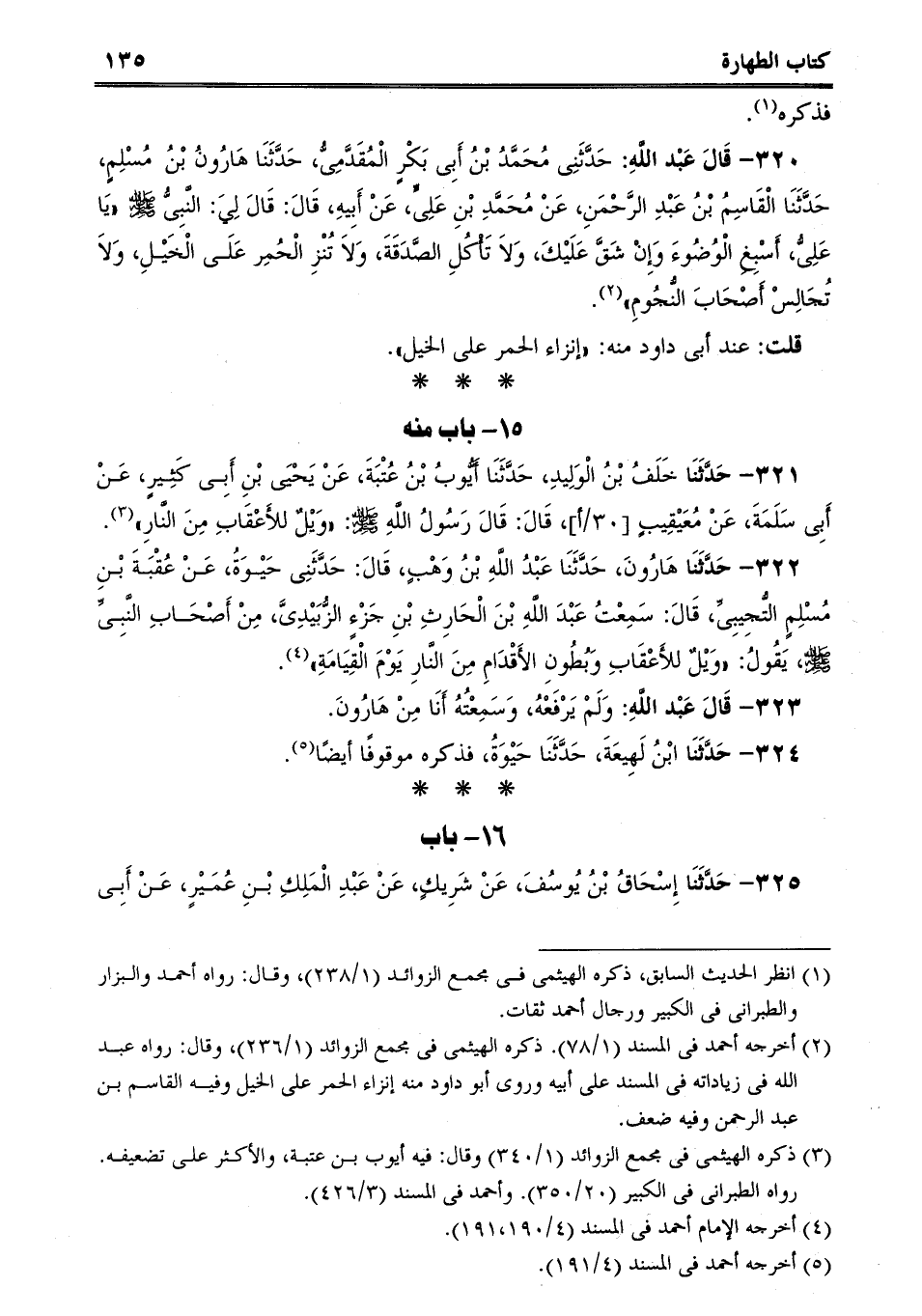 320 - قَالَ عَبْد اللَّهِ: حَدَّثَنِى مُحَمَّدُ بْنُ أَبِى بَكْرٍ الْمُقَدَّمِىُّ، حَدَّثَنَا هَارُونُ بْنُ مُسْلِمٍ، حَدَّثَنَا الْقَاسِمُ بْنُ عَبْدِ الرَّحْمَنِ، عَنْ مُحَمَّدِ بْنِ عَلِىٍّ، عَنْ أَبِيهِ، قَالَ: قَالَ لِيَ: النَّبِىُّ صلى الله عليه وسلم "يَا عَلِىُّ، أَسْبِغِ الْوُضُوءَ وَإِنْ شَقَّ عَلَيْكَ، وَلاَ تَأْكُلِ الصَّدَقَةَ، وَلاَ تُنْزِ الْحُمِر عَلَى الْخَيْلِ، وَلاَ تُجَالِسْ أَصْحَابَ النُّجُومِ.