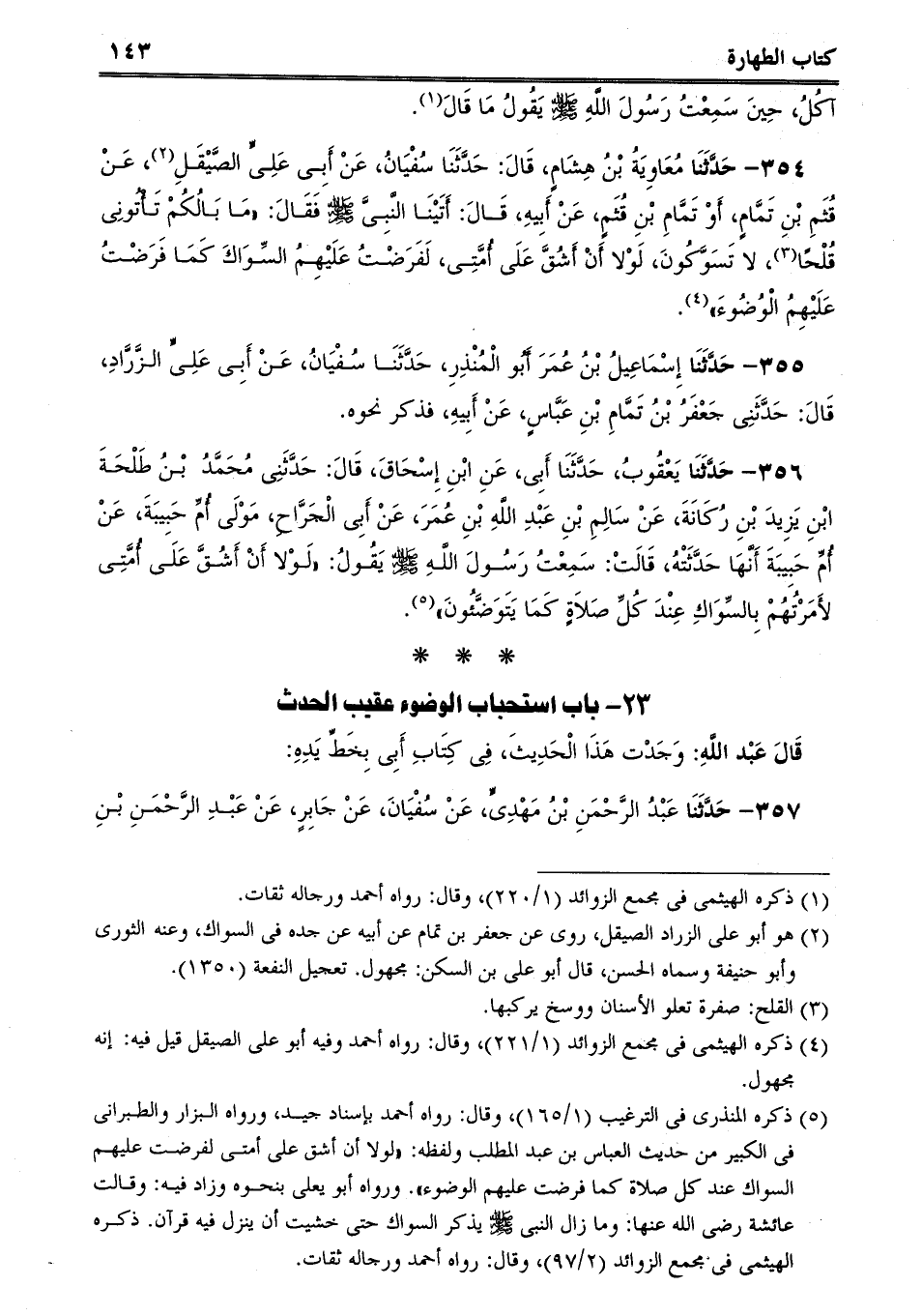 356 - حَدَّثَنَا يَعْقُوبُ، حَدَّثَنَا أَبِى، عَنِ ابْنِ إِسْحَاقَ، قَالَ: حَدَّثَنِى مُحَمَّدُ بْنُ طَلْحَةَ ابْنِ يَزِيدَ بْنِ رُكَانَةَ، عَنْ سَالِمِ بْنِ عَبْدِ اللَّهِ بْنِ عُمَرَ، عَنْ أَبِى الْجَرَّاحِ، مَوْلَى أُمِّ حَبِيبَةَ، عَنْ أُمِّ حَبِيبَةَ أَنَّهَا حَدَّثَتْهُ، قَالَتْ: سَمِعْتُ رَسُولَ اللَّهِ صلى الله عليه وسلم يَقُولُ: "لَوْلا أَنْ أَشُقَّ عَلَى أُمَّتِى لأَمَرْتُهُمْ بِالسِّوَاكِ عِنْدَ كُلِّ صَلاَةٍ كَمَا يَتَوَضَّئُونَ.