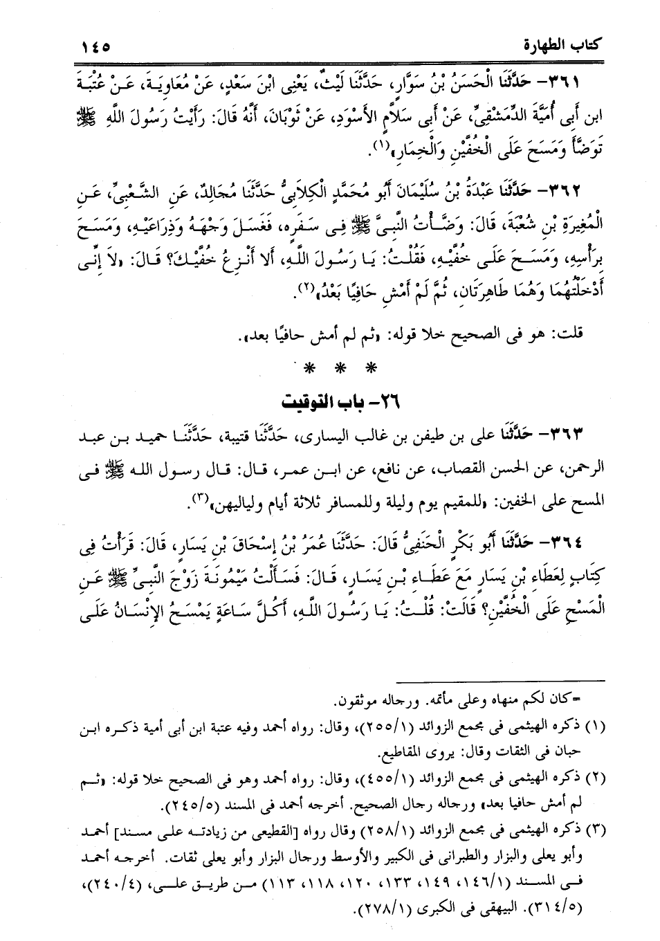 364 - حَدَّثَنَا أَبُو بَكْرٍ الْحَنَفِىُّ قَالَ: حَدَّثَنَا عُمَرُ بْنُ إِسْحَاقَ بْنِ يَسَارٍ، قَالَ: قَرَأْتُ فِى كِتَابٍ لِعَطَاءِ بْنِ يَسَارٍ مَعَ عَطَاءِ بْنِ يَسَارٍ، قَالَ: فَسَأَلْتُ مَيْمُونَةَ زَوْجَ النَّبِىِّ صلى الله عليه وسلم عَنِ الْمَسْحِ عَلَى الْخُفَّيْنِ؟ قَالَتْ: قُلْتُ: يَا رَسُولَ اللَّهِ، أَكُلَّ سَاعَةٍ يَمْسَحُ الإِنْسَانُ عَلَى -[146]- الْخُفَّيْنِ وَلا يَنْزِعُهُمَا؟ قَالَ: "نَعَمْ.
