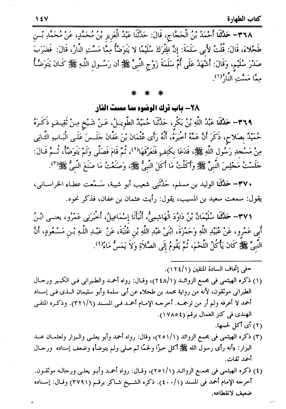 368 - حَدَّثَنَا أَحْمَدُ بْنُ الْحَجَّاجِ، قَالَ: حَدَّثَنَا عَبْدُ الْعَزِيزِ بْنُ مُحَمَّدٍ، عَنْ مُحَمَّدِ بْنِ طَحْلاءَ، قَالَ: قُلْتُ لأَبِى سَلَمَةَ: إِنَّ ظِئْرَكَ سُلَيْمًا لا يَتَوَضَّأُ مِمَّا مَسَّتِ النَّارُ، قَالَ: فَضَرَبَ صَدْرَ سُلَيْمٍ، وَقَالَ: أَشْهَدُ عَلَى أُمِّ سَلَمَةَ زَوْجِ النَّبِىِّ صلى الله عليه وسلم أن رَسُولِ اللَّهِ صلى الله عليه وسلم كَانَ يَتَوَضَّأُ مِمَّا مَسَّتِ النَّارُ.