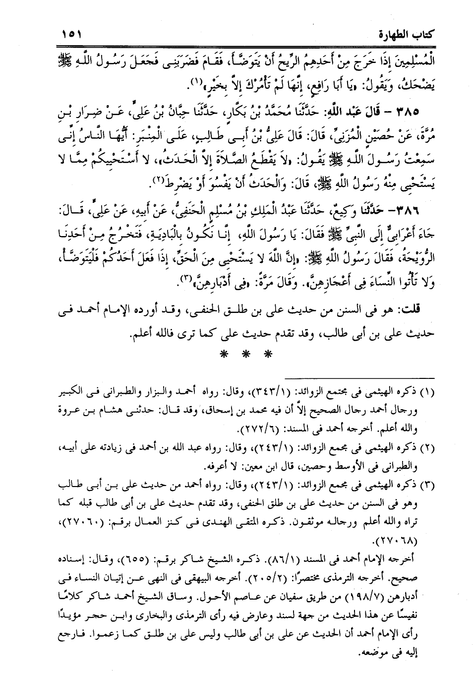قلت: هو فى السنن من حديث على بن طلق الحنفى، وقد أورده الإمام أحمد فى حديث على بن أبى طالب، وقد تقدم حديث على كما ترى فالله أعلم.