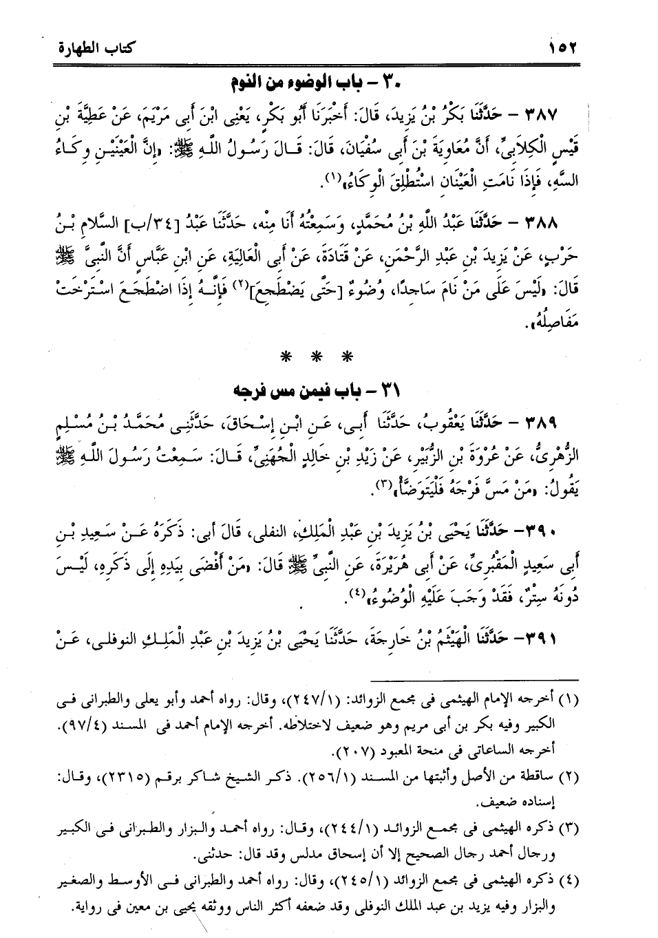 387 - حَدَّثَنَا بَكْرُ بْنُ يَزِيدَ، قَالَ: أَخْبَرَنَا أَبُو بَكْرٍ، يَعْنِى ابْنَ أَبِى مَرْيَمَ، عَنْ عَطِيَّةَ بْنِ قَيْسٍ الْكِلاَبِىِّ، أَنَّ مُعَاوِيَةَ بْنَ أَبِى سُفْيَانَ، قَالَ: قَالَ رَسُولُ اللَّهِ صلى الله عليه وسلم: "إِنَّ الْعَيْنَيْنِ وِكَاءُ السَّهِ، فَإِذَا نَامَتِ الْعَيْنَانِ اسْتُطْلِقَ الْوِكَاءُ.