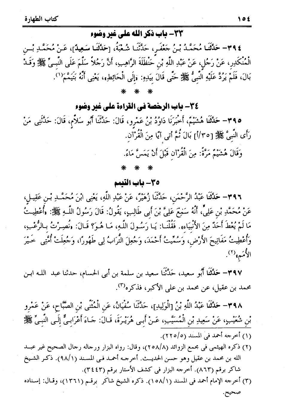 395 - حَدَّثَنَا هُشَيْمٌ، أَخْبَرَنَا دَاوُدُ بْنُ عَمْرٍو، قَالَ: حَدَّثَنَا أَبُو سَلاَّمٍ، قَالَ: حَدَّثَنِى مَنْ رَأَى النَّبِىَّ صلى الله عليه وسلم بَالَ ثُمَّ أتى آيًا مِنَ الْقُرْآنِ.