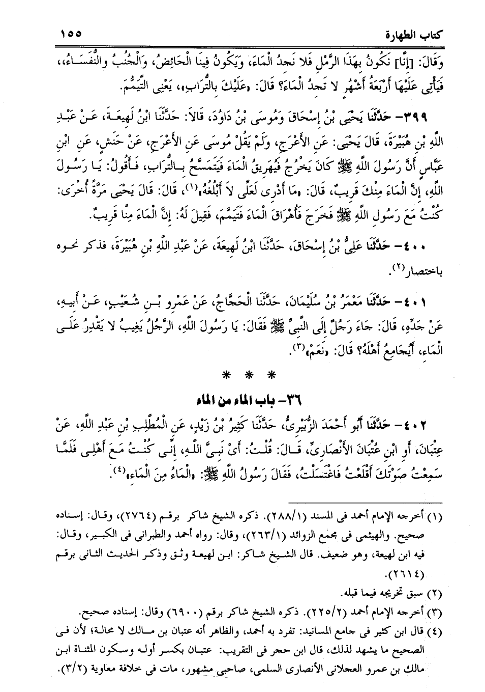 399 - حَدَّثَنَا يَحْيَى بْنُ إِسْحَاقَ وَمُوسَى بْنُ دَاوُدَ، قَالاَ: حَدَّثَنَا ابْنُ لَهِيعَةَ، عَنْ عَبْدِ اللَّهِ بْنِ هُبَيْرَةَ، قَالَ يَحْيَى: عَنِ الأَعْرَجِ، وَلَمْ يَقُلْ مُوسَى عَنِ الأَعْرَجِ، عَنْ حَنَشٍ، عَنِ ابْنِ عَبَّاسٍ أَنَّ رَسُولَ اللَّهِ صلى الله عليه وسلم كَانَ يَخْرُجُ فَيُهَرِيقُ الْمَاءَ فَيَتَمَسَّحُ بِالتُّرَابِ، فَأَقُولُ: يَا رَسُولَ اللَّهِ، إِنَّ الْمَاءَ مِنْكَ قَرِيبٌ، قَالَ: "مَا أَدْرِى لَعَلِّى لاَ أَبْلُغُهُ، قَالَ: قَالَ يَحْيَى مَرَّةً أُخْرَى: كُنْتُ مَعَ رَسُولِ اللَّهِ صلى الله عليه وسلم فَخَرَجَ فَأُهْرَاقَ الْمَاءَ فَتَيَمَّمَ، فَقِيلَ لَهُ: إِنَّ الْمَاءَ مِنَّا قَرِيبٌ.