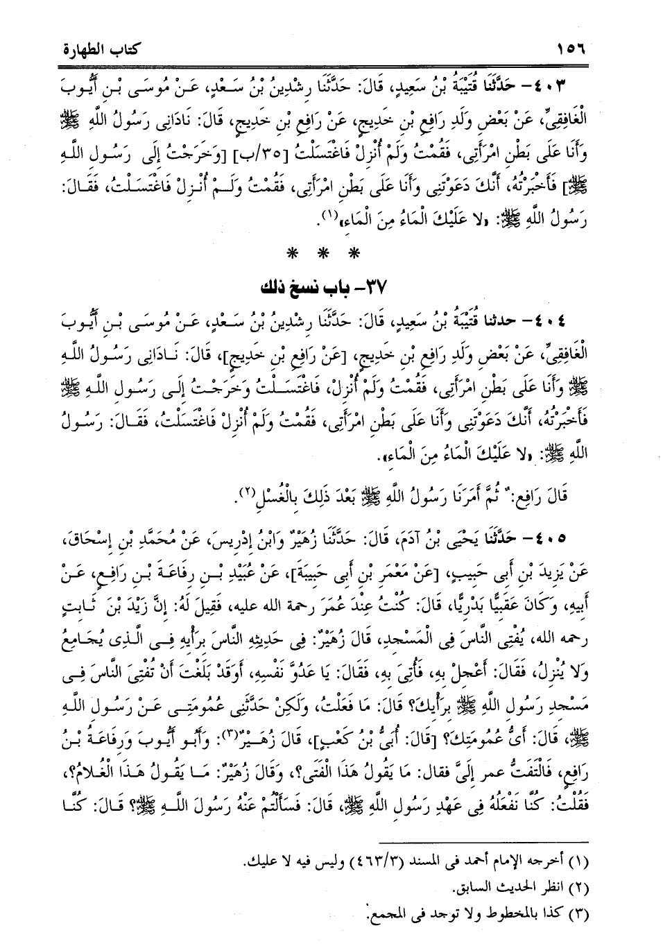 403 - حَدَّثَنَا قُتَيْبَةُ بْنُ سَعِيدٍ، قَالَ: حَدَّثَنَا رِشْدِينُ بْنُ سَعْدٍ، عَنْ مُوسَى بْنِ أَيُّوبَ الْغَافِقِىِّ، عَنْ بَعْضِ وَلَدِ رَافِعِ بْنِ خَدِيجٍ، عَنْ رَافِعِ بْنِ خَدِيجٍ، قَالَ: نَادَانِى رَسُولُ اللَّهِ صلى الله عليه وسلم وَأَنَا عَلَى بَطْنِ امْرَأَتِى، فَقُمْتُ وَلَمْ أُنْزِلْ فَاغْتَسَلْتُ [وَخَرَجْتُ إِلَى رَسُولِ اللَّهِ صلى الله عليه وسلم] فَأَخْبَرْتُهُ، أَنَّكَ دَعَوْتَنِى وَأَنَا عَلَى بَطْنِ امْرَأَتِى، فَقُمْتُ وَلَمْ أُنْزِلْ فَاغْتَسَلْتُ، فَقَالَ: رَسُولُ اللَّهِ صلى الله عليه وسلم: "لا عَلَيْكَ الْمَاءُ مِنَ الْمَاءِ.