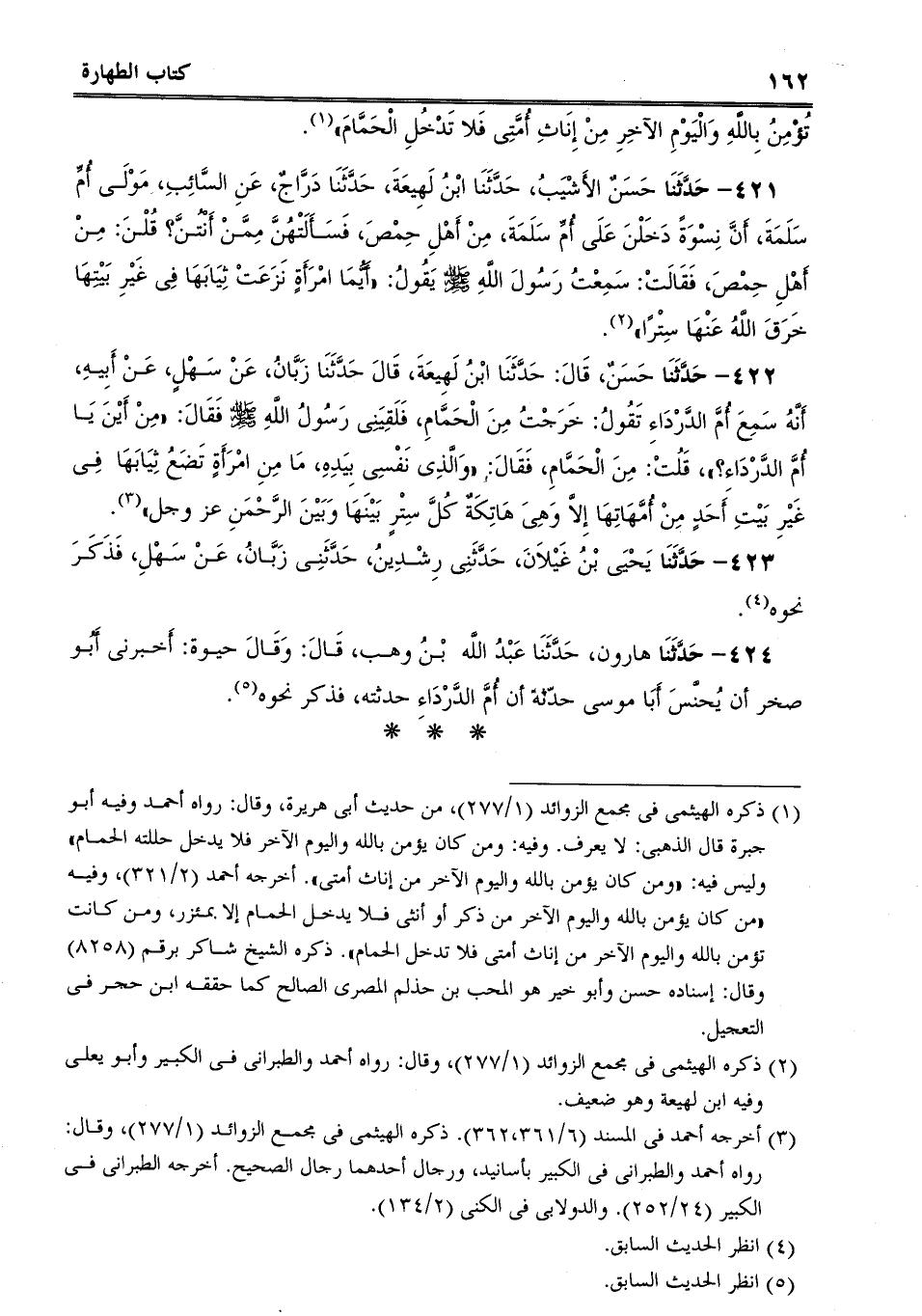 422 - حَدَّثَنَا حَسَنٌ، قَالَ: حَدَّثَنَا ابْنُ لَهِيعَةَ، قَالَ حَدَّثَنَا زَبَّانُ، عَنْ سَهْلٍ، عَنْ أَبِيهِ، أَنَّهُ سَمِعَ أُمَّ الدَّرْدَاءِ تَقُولُ: خَرَجْتُ مِنَ الْحَمَّامِ، فَلَقِيَنِى رَسُولُ اللَّهِ صلى الله عليه وسلم فَقَالَ: "مِنْ أَيْنَ يَا أُمَّ الدَّرْدَاءِ؟، قَلُتْ: مِنَ الْحَمَّامِ، فَقَالَ: "وَالَّذِى نَفْسِى بِيَدِهِ، مَا مِنِ امْرَأَةٍ تَضَعُ ثِيَابَهَا فِى غَيْرِ بَيْتِ أَحَدٍ مِنْ أُمَّهَاتِهَا إِلاَّ وَهِىَ هَاتِكَةٌ كُلَّ سِتْرٍ بَيْنَهَا وَبَيْنَ الرَّحْمَنِ عز وجل.