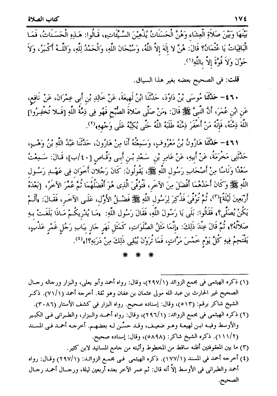 461 - حَدَّثَنَا هَارُونُ بْنُ مَعْرُوفٍ، وَسَمِعْتُهُ أَنَا مِنْ هَارُونَ، حَدَّثَنَا عَبْدُ اللَّهِ بْنُ وَهْبٍ، حَدَّثَنِى مَخْرَمَةُ، عَنْ أَبِيهِ، عَنْ عَامِرِ بْنِ سَعْدِ بْنِ أَبِى وَقَّاصٍ، قَالَ: سَمِعْتُ سَعْدًا وَنَاسًا مِنْ أَصْحَابِ رَسُولِ اللَّهِ صلى الله عليه وسلم، يَقُولُونَ: كَانَ رَجُلانِ أَخَوَانِ فِى عَهْدِ رَسُولِ اللَّهِ صلى الله عليه وسلم وَكَانَ أَحَدُهُمَا أَفْضَلَ مِنَ الآخَرِ، فَتُوُفِّىَ الَّذِى هُوَ أَفْضَلُهُمَا ثُمَّ عُمِّرَ الآخَرُ، [بَعْدَهُ أَرْبَعِينَ لَيْلَةً] ، ثُمَّ تُوُفِّىَ فَذُكِرَ لِرَسُولِ اللَّهِ صلى الله عليه وسلم فَضْلُ الأَوَّلِ، عَلَى الآخَرِ، فَقَالَ: "أَلَمْ يَكُنْ يُصَلِّى؟ فَقَالُوا: بَلَى يَا رَسُولَ اللَّهِ، فَقَالَ رَسُول اللَّهِ: "مَا يُدْرِيكُمْ مَاذَا بَلَغَتْ بِهِ صَلاَتُهُ؟ ثُمَّ قَالَ عِنْدَ ذَلِكَ: "إِنَّمَا مَثَلُ الصَّلَوَاتِ، كَمَثَلِ نَهَرٍ جَارٍ بِبَابِ رَجُلٍ غَمْرٍ عَذْبٍ، يَقْتَحِمُ فِيهِ كُلَّ يَوْمٍ خَمْسَ مَرَّاتٍ، فَمَا تُرَوْنَ يُبْقِى ذَلِكَ مِنْ دَرَنِهِ؟!.