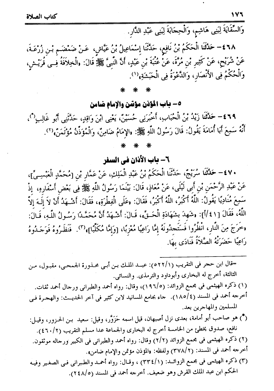 469 - حَدَّثَنَا زَيْدُ بْنُ الْحُبَابِ، أَخْبَرَنِى حُسَيْنٌ، يَعْنِى ابْنَ وَاقِدٍ، حَدَّثَنِى أَبُو غَالِبٍ، أَنَّهُ سَمِعَ أَبَا أُمَامَةَ يَقُولُ: قَالَ رَسُولُ اللَّهِ صلى الله عليه وسلم: "الإِمَامُ ضَامِنٌ، وَالْمُؤَذِّنُ مُؤْتَمَنٌ.