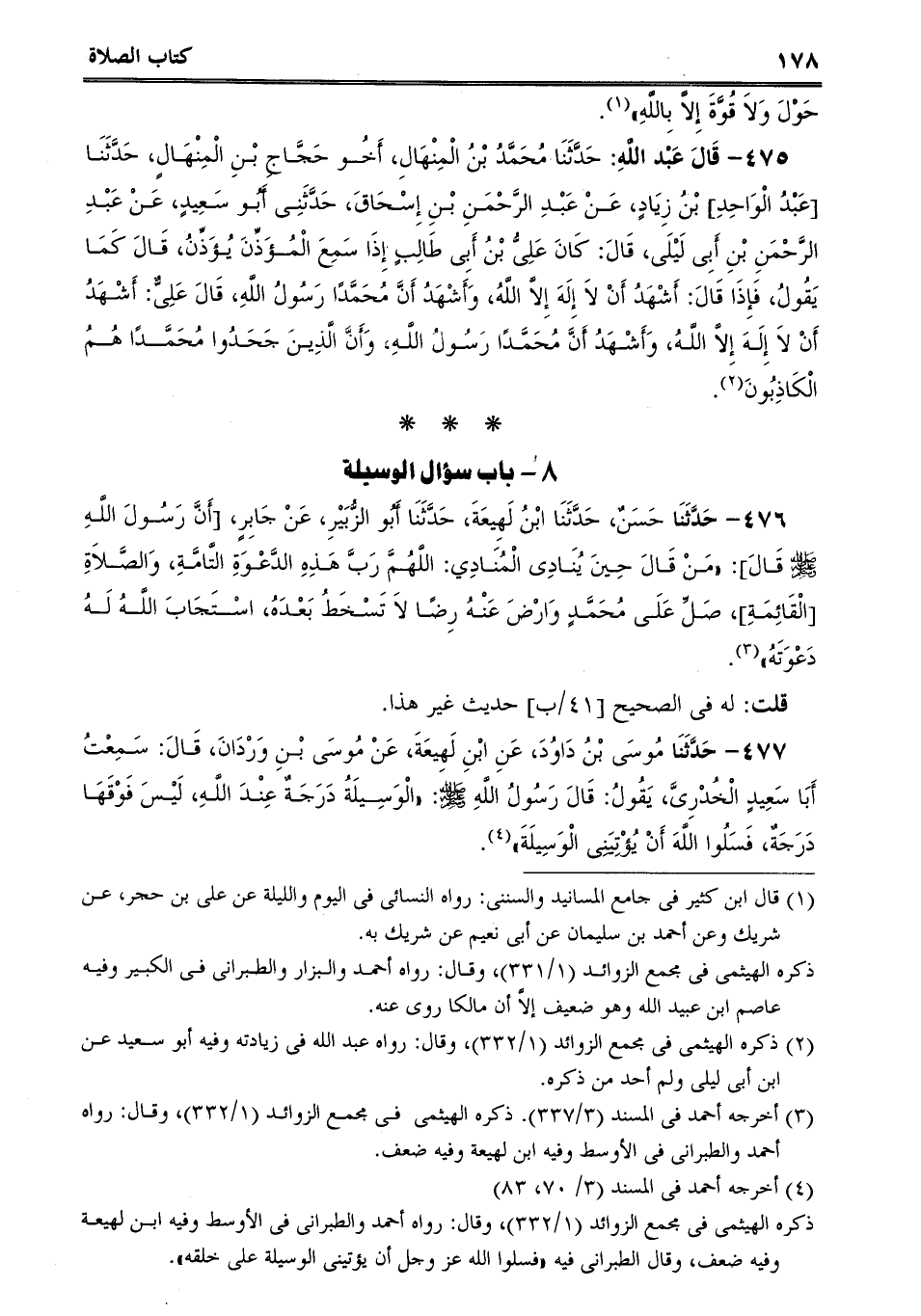 475 - قَالَ عَبْد اللَّهِ: حَدَّثَنَا مُحَمَّدُ بْنُ الْمِنْهَالِ، أَخُو حَجَّاجِ بْنِ الْمِنْهَالٍ، حَدَّثَنَا [عَبْدُ الْوَاحِدِ] بْنُ زِيَادٍ، عَنْ عَبْدِ الرَّحْمَنِ بْنِ إِسْحَاقَ، حَدَّثَنِى أَبُو سَعِيدٍ، عَنْ عَبْدِ الرَّحْمَنِ بْنِ أَبِى لَيْلَى، قَالَ: كَانَ عَلِىُّ بْنُ أَبِى طَالِبٍ إِذَا سَمِعَ الْمُؤَذِّنَ يُؤَذِّنُ، قَالَ كَمَا يَقُولُ، فَإِذَا قَالَ: أَشْهَدُ أَنْ لاَ إِلَهَ إِلاَّ اللَّهُ، وَأَشْهَدُ أَنَّ مُحَمَّدًا رَسُولُ اللَّهِ، قَالَ عَلِىٌّ: أَشْهَدُ أَنْ لاَ إِلَهَ إِلاَّ اللَّهُ، وَأَشْهَدُ أَنَّ مُحَمَّدًا رَسُولُ اللَّهِ، وَأَنَّ الَّذِينَ جَحَدُوا مُحَمَّدًا هُمُ الْكَاذِبُونَ.