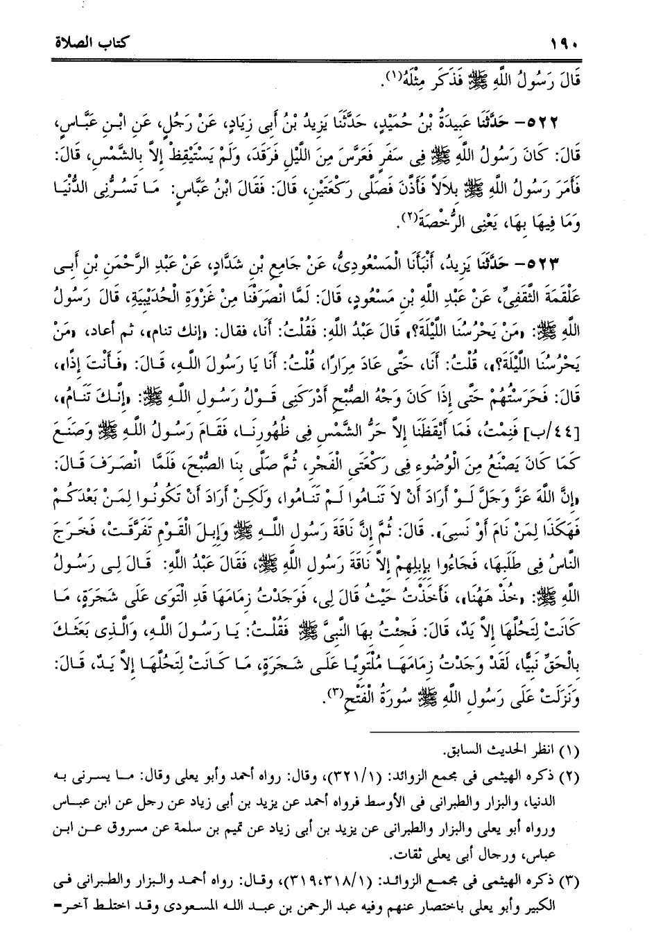 523 - حَدَّثَنَا يَزِيدُ، أَنْبَأَنَا الْمَسْعُودِىُّ، عَنْ جَامِعِ بْنِ شَدَّادٍ، عَنْ عَبْدِ الرَّحْمَنِ بْنِ أَبِى عَلْقَمَةَ الثَّقَفِىِّ، عَنْ عَبْدِ اللَّهِ بْنِ مَسْعُودٍ، قَالَ: لَمَّا انْصَرَفْنَا مِنْ غَزْوَةِ الْحُدَيْبِيَةِ، قَالَ رَسُولُ اللَّهِ صلى الله عليه وسلم: "مَنْ يَحْرُسُنَا اللَّيْلَةَ؟ قَالَ عَبْدُ اللَّهِ: فَقُلْتُ: أَنَا، فقال: «إنك تنام، ثم أعاد،» مَنْ يَحْرُسُنَا اللَّيْلَةَ؟، قُلْتُ: أَنَا، حَتَّى عَادَ مِرَارًا، قُلْتُ: أَنَا يَا رَسُولَ اللَّهِ، قَالَ: "فَأَنْتَ إِذًا، قَالَ: فَحَرَسْتُهُمْ حَتَّى إِذَا كَانَ وَجْهُ الصُّبْحِ أَدْرَكَنِى قَوْلُ رَسُولِ اللَّهِ صلى الله عليه وسلم: "إِنَّكَ تَنَامُ، فَنِمْتُ، فَمَا أَيْقَظَنَا إِلاَّ حَرُّ الشَّمْسِ فِى ظُهُورِنَا، فَقَامَ رَسُولُ اللَّهِ صلى الله عليه وسلم وَصَنَعَ كَمَا كَانَ يَصْنَعُ مِنَ الْوُضُوءِ فِى رَكْعَتَىِ الْفَجْرِ، ثُمَّ صَلَّى بِنَا الصُّبْحَ، فَلَمَّا انْصَرَفَ قَالَ: "إِنَّ اللَّهَ عَزَّ وَجَلَّ لَوْ أَرَادَ أَنْ لاَ تَنَامُوا لَمْ تَنَامُوا، وَلَكِنْ أَرَادَ أَنْ تَكُونُوا لِمَنْ بَعْدَكُمْ فَهَكَذَا لِمَنْ نَامَ أَوْ نَسِىَ. قَالَ: ثُمَّ إِنَّ نَاقَةَ رَسُولِ اللَّهِ صلى الله عليه وسلم وَإِبِلَ الْقَوْمِ تَفَرَّقَتْ، فَخَرَجَ النَّاسُ فِى طَلَبِهَا، فَجَاءُوا بِإِبِلِهِمْ إِلاَّ نَاقَةَ رَسُولِ اللَّهِ صلى الله عليه وسلم، فَقَالَ عَبْدُ اللَّهِ: قَالَ لِى رَسُولُ اللَّهِ صلى الله عليه وسلم: "خُذْ هَهُنَا، فَأَخَذْتُ حَيْثُ قَالَ لِى، فَوَجَدْتُ زِمَامَهَا قَدِ الْتَوَى عَلَى شَجَرَةٍ، مَا كَانَتْ لِتَحُلَّهَا إِلاَّ يَدٌ، قَالَ: فَجِئْتُ بِهَا النَّبِىَّ صلى الله عليه وسلم فَقُلْتُ: يَا رَسُولَ اللَّهِ، وَالَّذِى بَعَثَكَ بِالْحَقِّ نَبِيًّا، لَقَدْ وَجَدْتُ زِمَامَهَا