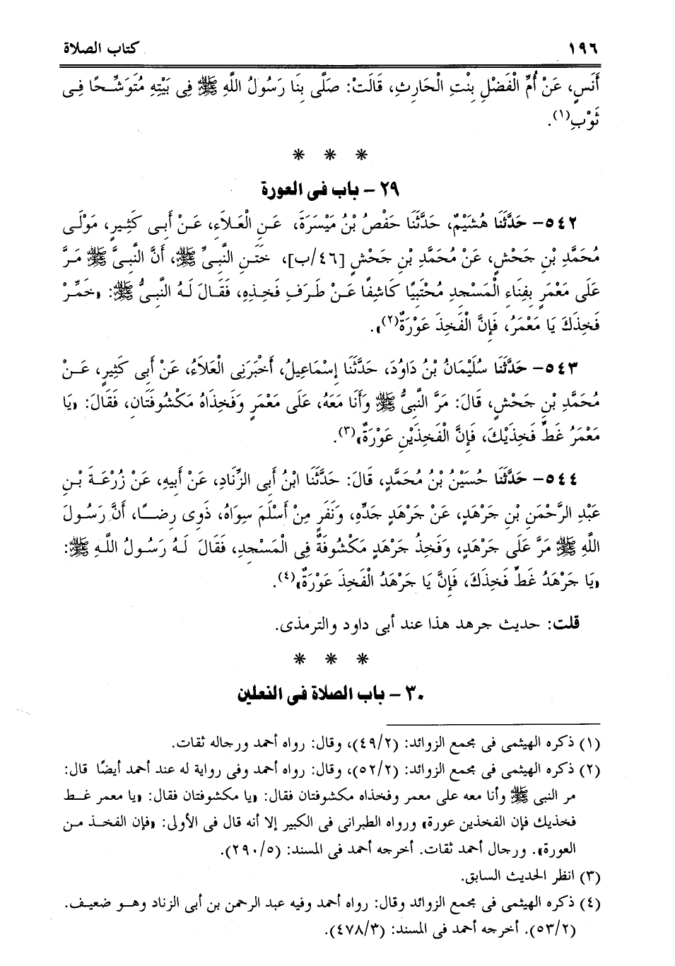 542 - حَدَّثَنَا هُشَيْمٌ، حَدَّثَنَا حَفْصُ بْنُ مَيْسَرَةَ، عَنِ الْعَلاَءِ، عَنْ أَبِى كَثِيرٍ، مَوْلَى مُحَمَّدِ بْنِ جَحْشٍ، عَنْ مُحَمَّدِ بْنِ جَحْشٍ، خَتَنِ النَّبِىِّ صلى الله عليه وسلم، أَنَّ النَّبِىَّ صلى الله عليه وسلم مَرَّ عَلَى مَعْمَرٍ بِفِنَاءِ الْمَسْجِدِ مُحْتَبِيًا كَاشِفًا عَنْ طَرَفِ فَخِذِهِ، فَقَالَ لَهُ النَّبِىُّ صلى الله عليه وسلم: "خَمِّرْ فَخِذَكَ يَا مَعْمَرُ، فَإِنَّ الْفَخِذَ عَوْرَةٌ.