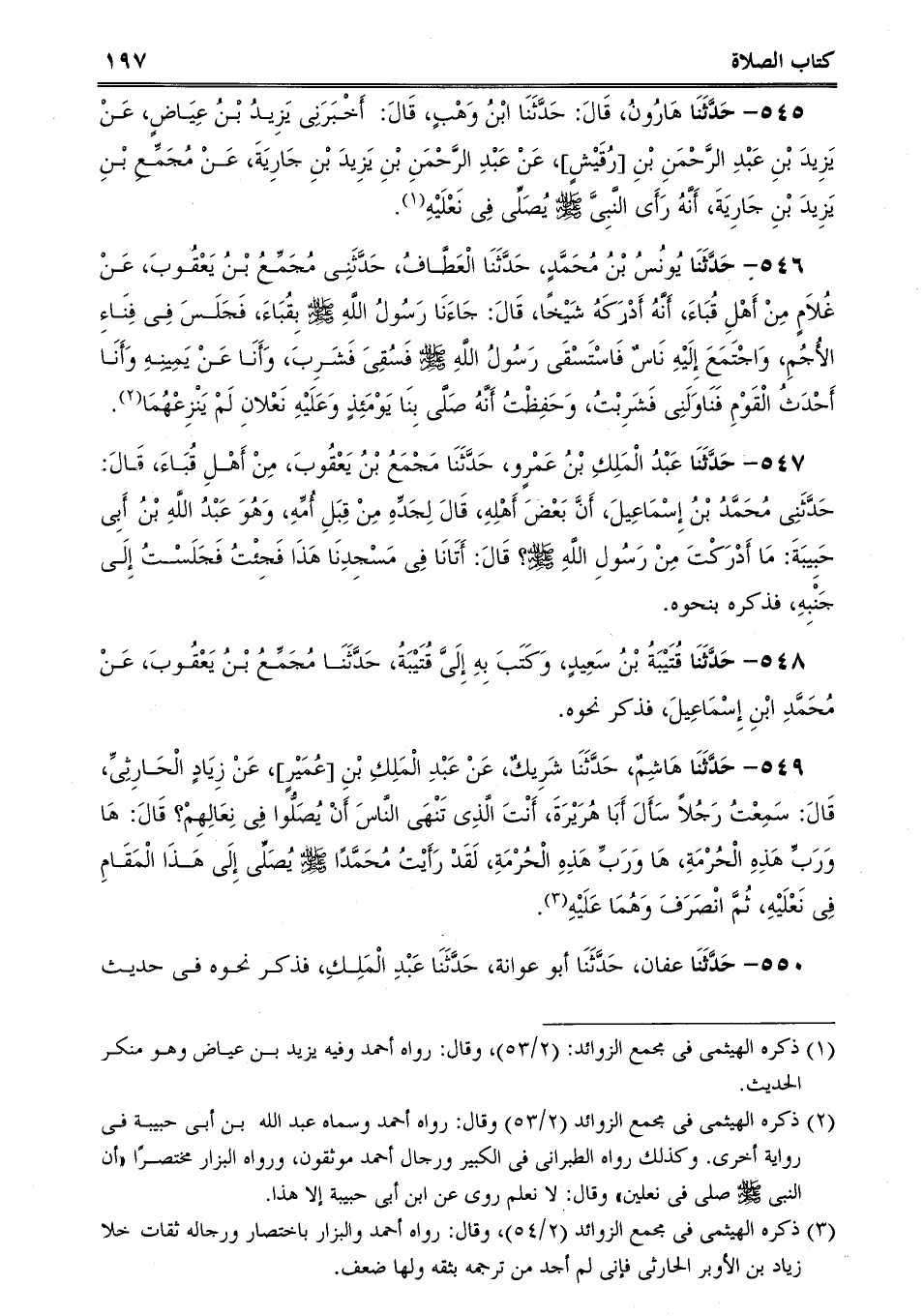 545 - حَدَّثَنَا هَارُونُ، قَالَ: حَدَّثَنَا ابْنُ وَهْبٍ، قَالَ: أَخْبَرَنِى يَزِيدُ بْنُ عِيَاضٍ، عَنْ يَزِيدَ بْنِ عَبْدِ الرَّحْمَنِ بْنِ [رُقَيْشٍ] ، عَنْ عَبْدِ الرَّحْمَنِ بْنِ يَزِيدَ بْنِ جَارِيَةَ، عَنْ مُجَمِّعِ بْنِ يَزِيدَ بْنِ جَارِيَةَ، أَنَّهُ رَأَى النَّبِىَّ صلى الله عليه وسلم يُصَلِّى فِى نَعْلَيْهِ.