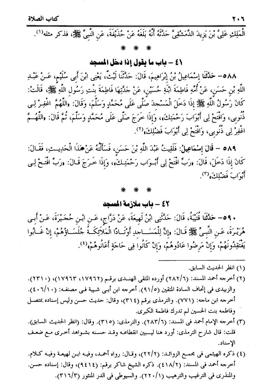 588 - حَدَّثَنَا إِسْمَاعِيلُ بْنُ إِبْرَاهِيمَ، قَالَ: حَدَّثَنَا لَيْثٌ، يَعْنِى ابْنَ أَبِى سُلَيْمٍ، عَنْ عَبْدِ اللَّهِ بْنِ حَسَنٍ، عَنْ أُمِّهِ فَاطِمَةَ ابْنَةِ حُسَيْنٍ، عَنْ جَدَّتِهَا فَاطِمَةَ بِنْتِ رَسُولِ اللَّهِ صلى الله عليه وسلم، قَالَتْ: كَانَ رَسُولُ اللَّهِ صلى الله عليه وسلم إِذَا دَخَلَ الْمَسْجِدَ صَلَّى عَلَى مُحَمَّدٍ وَسَلَّمَ، وَقَالَ: "اللَّهُمَّ اغْفِرْ لِى ذُنُوبِى، وَافْتَحْ لِى أَبْوَابَ رَحْمَتِكَ، وَإِذَا خَرَجَ صَلَّى عَلَى مُحَمَّدٍ وَسَلَّمَ، ثُمَّ قَالَ: "اللَّهُمَّ اغْفِرْ لِى ذُنُوبِى، وَافْتَحْ لِى أَبْوَابَ فَضْلِكَ.
