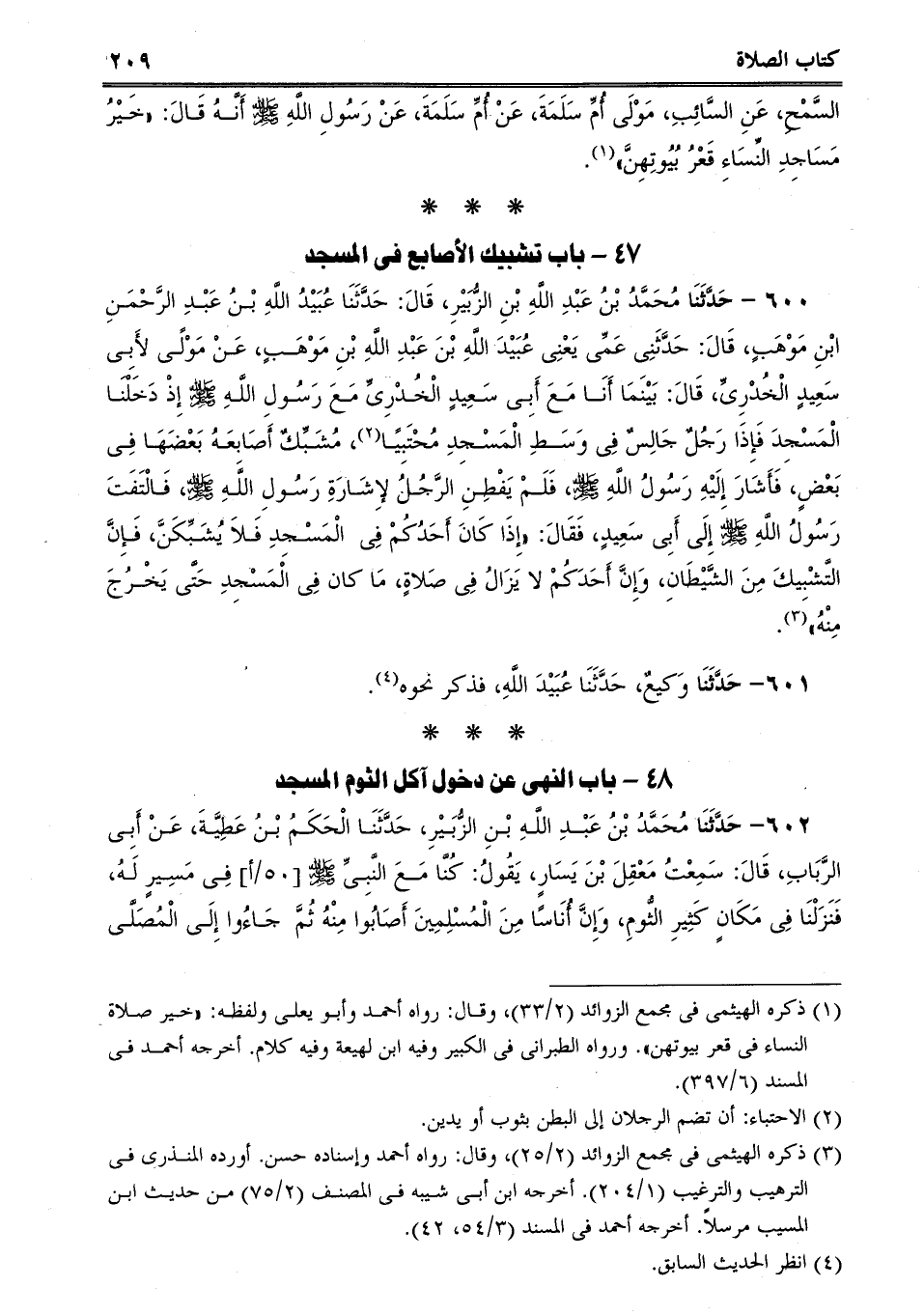 600 - حَدَّثَنَا مُحَمَّدُ بْنُ عَبْدِ اللَّهِ بْنِ الزُّبَيْرِ، قَالَ: حَدَّثَنَا عُبَيْدُ اللَّهِ بْنُ عَبْدِ الرَّحْمَنِ ابْنِ مَوْهَبٍ، قَالَ: حَدَّثَنِى عَمِّى يَعْنِى عُبَيْدَ اللَّهِ بْنَ عَبْدِ اللَّهِ بْنِ مَوْهَبٍ، عَنْ مَوْلًى لأَبِى سَعِيدٍ الْخُدْرِىِّ، قَالَ: بَيْنَمَا أَنَا مَعَ أَبِى سَعِيدٍ الْخُدْرِىِّ مَعَ رَسُولِ اللَّهِ صلى الله عليه وسلم إِذْ دَخَلْنَا الْمَسْجِدَ فَإِذَا رَجُلٌ جَالِسٌ فِى وَسَطِ الْمَسْجِدِ مُحْتَبِيًا، مُشَبِّكٌ أَصَابِعَهُ بَعْضَهَا فِى بَعْضٍ، فَأَشَارَ إِلَيْهِ رَسُولُ اللَّهِ صلى الله عليه وسلم، فَلَمْ يَفْطِنِ الرَّجُلُ لإِشَارَةِ رَسُولِ اللَّهِ صلى الله عليه وسلم، فَالْتَفَتَ رَسُولُ اللَّهِ صلى الله عليه وسلم إِلَى أَبِى سَعِيدٍ، فَقَالَ: "إِذَا كَانَ أَحَدُكُمْ فِى الْمَسْجِدِ فَلاَ يُشَبِّكَنَّ، فَإِنَّ التَّشْبِيكَ مِنَ الشَّيْطَانِ، وَإِنَّ أَحَدَكُمْ لا يَزَالُ فِى صَلاةٍ، مَا كان فِى الْمَسْجِدِ حَتَّى يَخْرُجَ مِنْهُ.