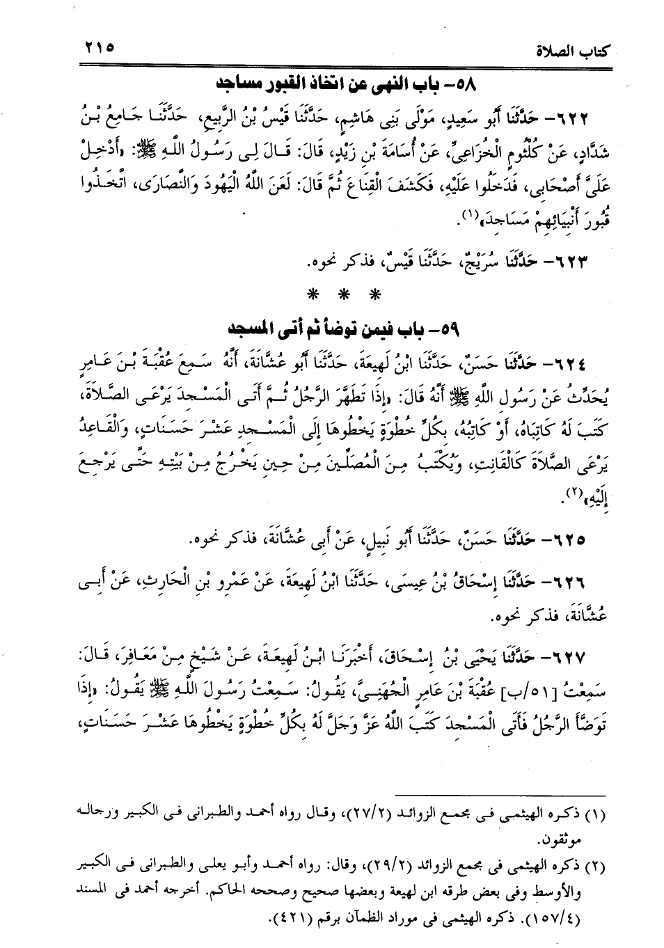 624 - حَدَّثَنَا حَسَنٌ، حَدَّثَنَا ابْنُ لَهِيعَةَ، حَدَّثَنَا أَبُو عُشَّانَةَ، أَنَّهُ سَمِعَ عُقْبَةَ بْنَ عَامِرٍ يُحَدِّثُ عَنْ رَسُولِ اللَّهِ صلى الله عليه وسلم أَنَّهُ قَالَ: "إِذَا تَطَهَّرَ الرَّجُلُ ثُمَّ أَتَى الْمَسْجِدَ يَرْعَى الصَّلاَةَ، كَتَبَ لَهُ كَاتِبَاهُ، أَوْ كَاتِبُهُ، بِكُلِّ خُطْوَةٍ يَخْطُوهَا إِلَى الْمَسْجِدِ عَشْرَ حَسَنَاتٍ، وَالْقَاعِدُ يَرْعَى الصَّلاَةَ كَالْقَانِتِ، وَيُكْتَبُ مِنَ الْمُصَلِّينَ مِنْ حِينِ يَخْرُجُ مِنْ بَيْتِهِ حَتَّى يَرْجِعَ إِلَيْهِ.