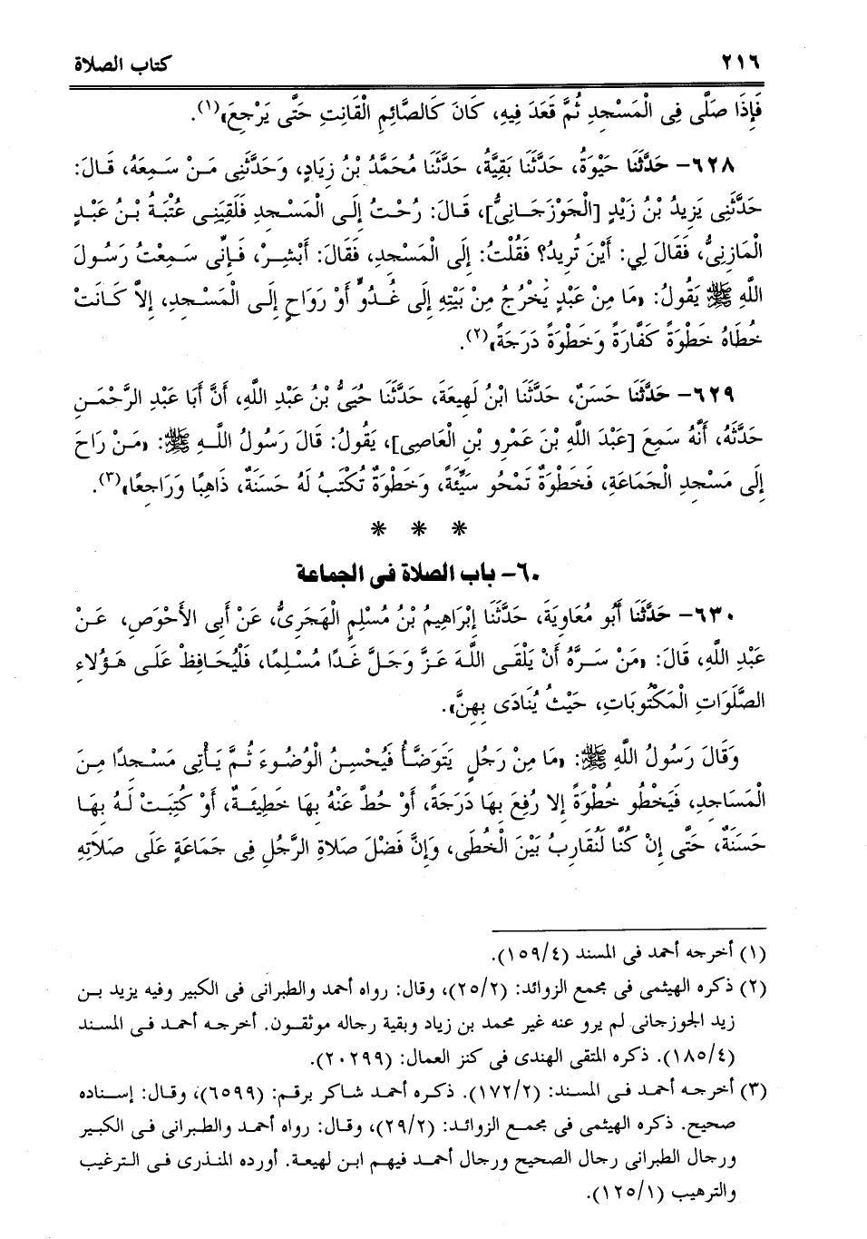 629 - حَدَّثَنَا حَسَنٌ، حَدَّثَنَا ابْنُ لَهِيعَةَ، حَدَّثَنَا حُيَىُّ بْنُ عَبْدِ اللَّهِ، أَنَّ أَبَا عَبْدِ الرَّحْمَنِ حَدَّثَهُ، أَنَّهُ سَمِعَ [عَبْدَ اللَّهِ بْنَ عَمْرِو بْنِ الْعَاصِى] ، يَقُولُ: قَالَ رَسُولُ اللَّهِ صلى الله عليه وسلم: "مَنْ رَاحَ إِلَى مَسْجِدِ الْجَمَاعَةِ، فَخَطْوَةٌ تَمْحُو سَيِّئَةً، وَخَطْوَةٌ تُكْتَبُ لَهُ حَسَنَةٌ، ذَاهِبًا وَرَاجِعًا.