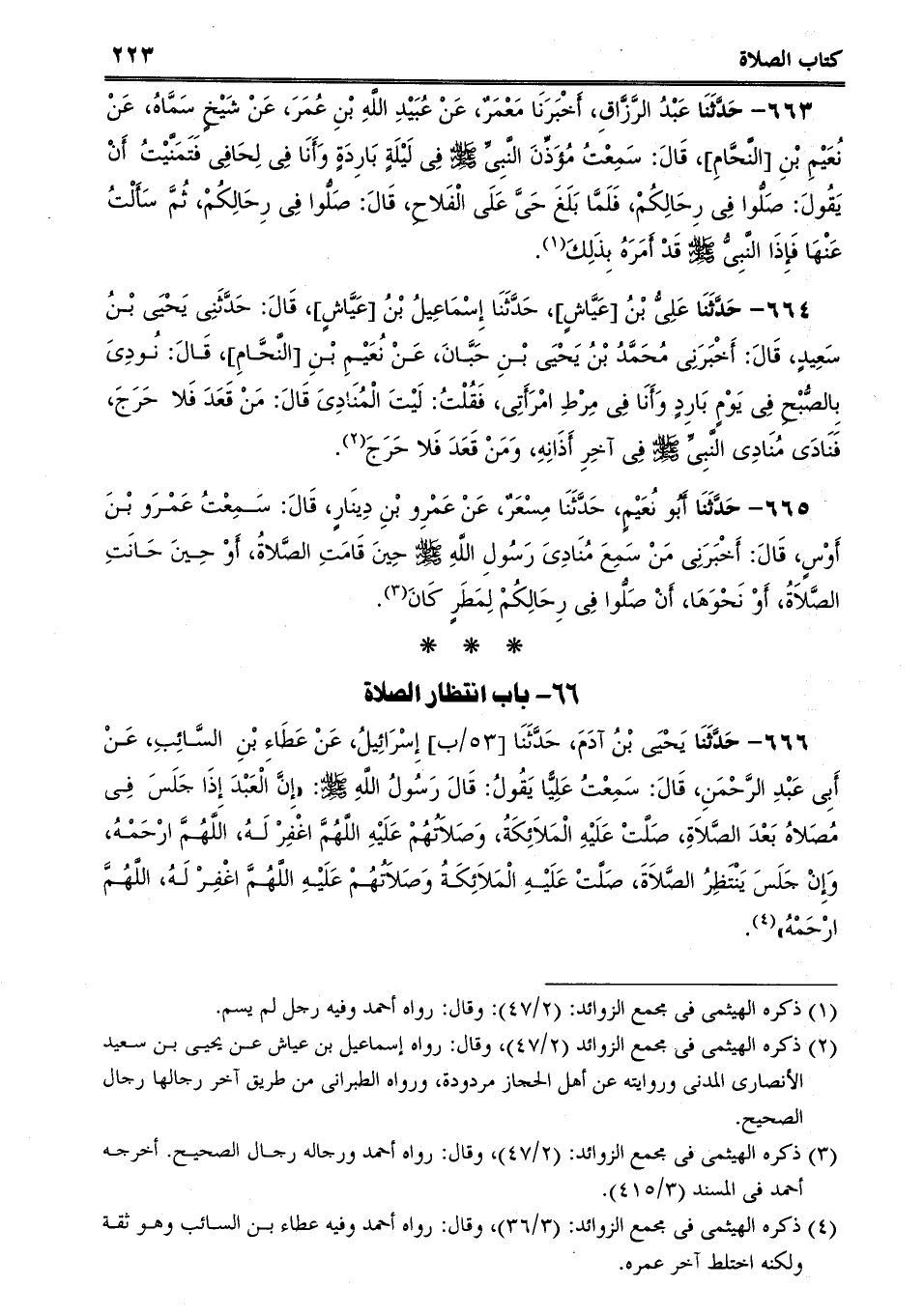 663 - حَدَّثَنَا عَبْدُ الرَّزَّاقِ، أَخْبَرَنَا مَعْمَرٌ، عَنْ عُبَيْدِ اللَّهِ بْنِ عُمَرَ، عَنْ شَيْخٍ سَمَّاهُ، عَنْ نُعَيْمِ بْنِ [النَّحَّامِ] ، قَالَ: سَمِعْتُ مُؤَذِّنَ النَّبِىِّ صلى الله عليه وسلم فِى لَيْلَةٍ بَارِدَةٍ وَأَنَا فِى لِحَافِى فَتَمَنَّيْتُ أَنْ يَقُولَ: صَلُّوا فِى رِحَالِكُمْ، فَلَمَّا بَلَغَ حَىَّ عَلَى الْفَلاحِ، قَالَ: صَلُّوا فِى رِحَالِكُمْ، ثُمَّ سَأَلْتُ عَنْهَا فَإِذَا النَّبِىُّ صلى الله عليه وسلم قَدْ أَمَرَهُ بِذَلِكَ.