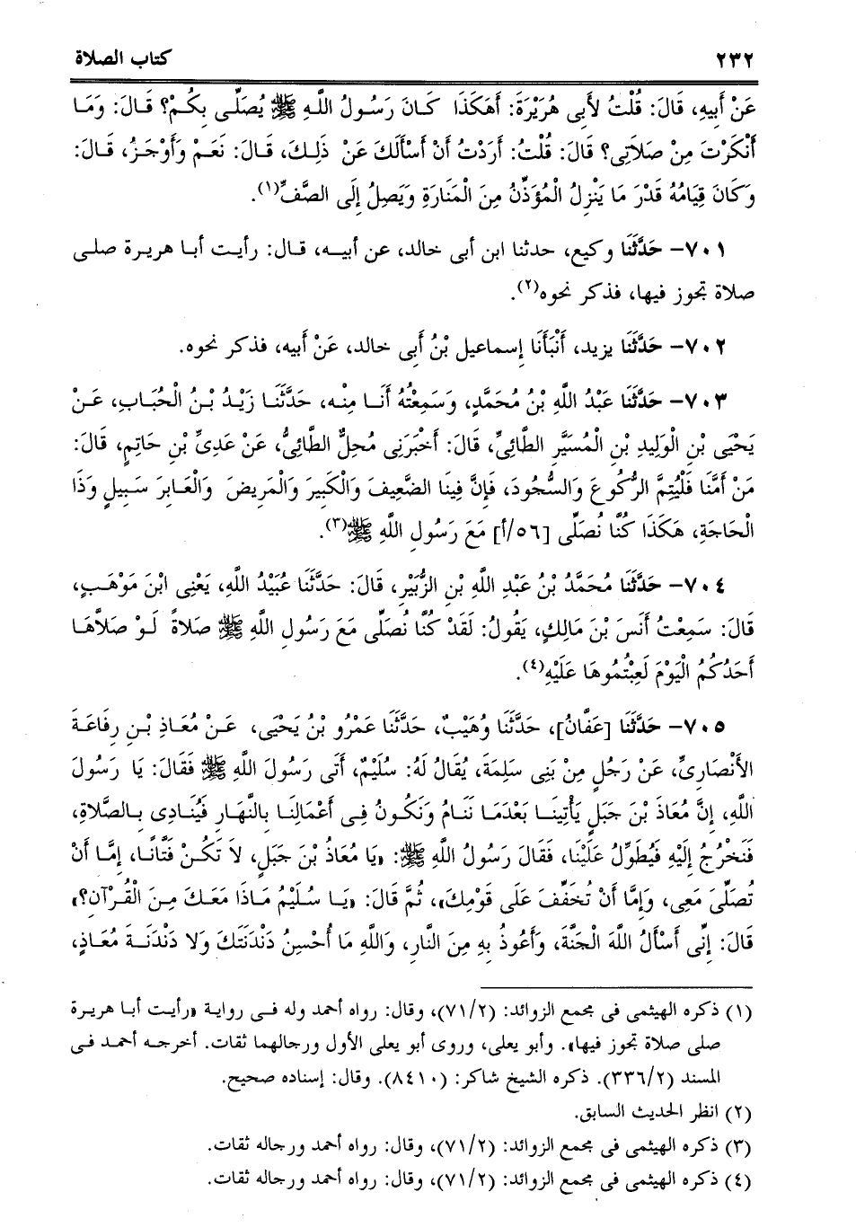 703 - حَدَّثَنَا عَبْدُ اللَّهِ بْنُ مُحَمَّدٍ، وَسَمِعْتُهُ أَنَا مِنْه، حَدَّثَنَا زَيْدُ بْنُ الْحُبَابِ، عَنْ يَحْيَى بْنِ الْوَلِيدِ بْنِ الْمُسَيَّرِ الطَّائِىِّ، قَالَ: أَخْبَرَنِى مُحِلٌّ الطَّائِىُّ، عَنْ عَدِىِّ بْنِ حَاتِمٍ، قَالَ: مَنْ أَمَّنَا فَلْيُتِمَّ الرُّكُوعَ وَالسُّجُودَ، فَإِنَّ فِينَا الضَّعِيفَ وَالْكَبِيرَ وَالْمَرِيضَ وَالْعَابِرَ سَبِيلٍ وَذَا الْحَاجَةِ، هَكَذَا كُنَّا نُصَلِّى مَعَ رَسُولِ اللَّهِ صلى الله عليه وسلم.