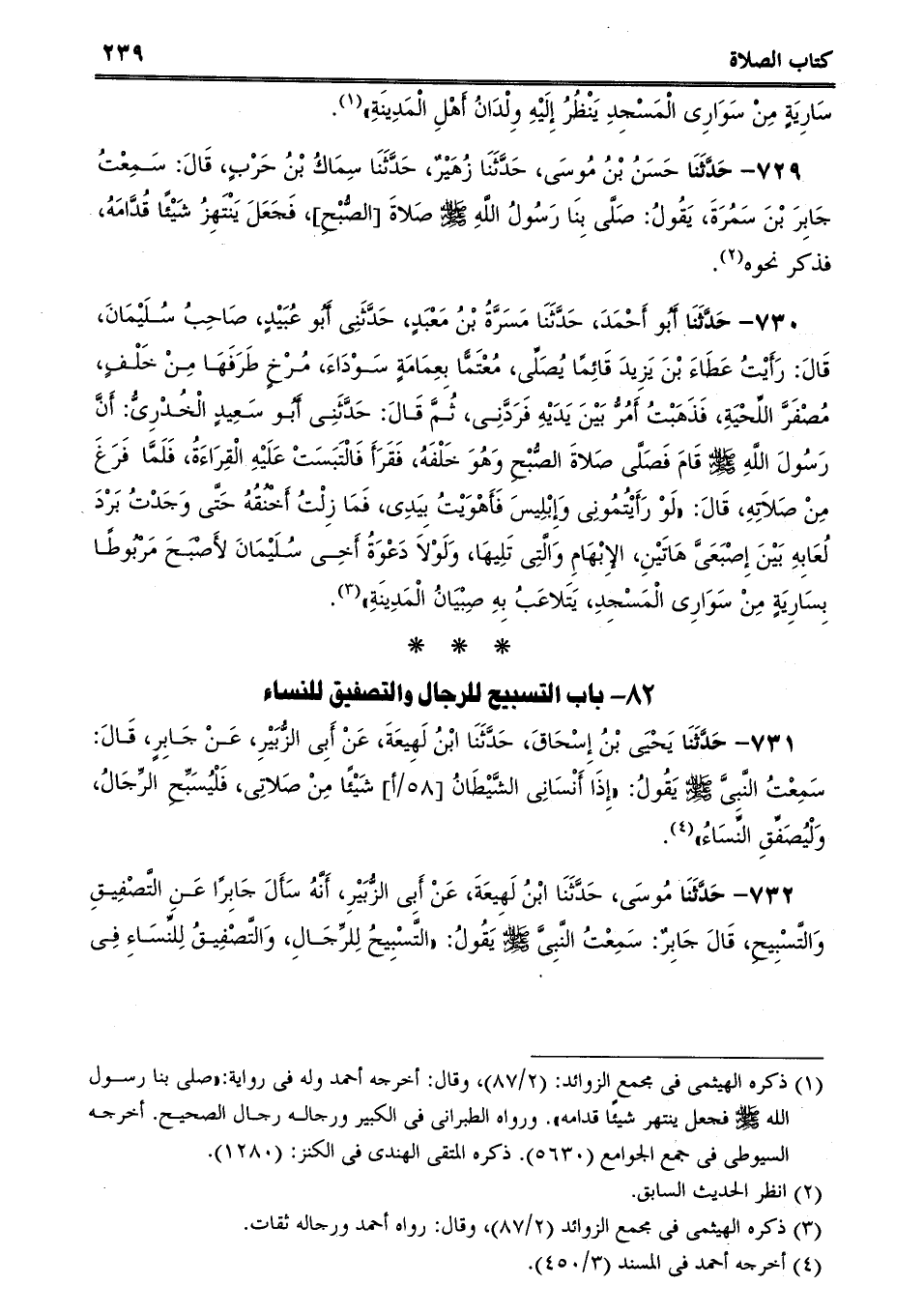 732 - حَدَّثَنَا مُوسَى، حَدَّثَنَا ابْنُ لَهِيعَةَ، عَنْ أَبِى الزُّبَيْرِ، أَنَّهُ سَأَلَ جَابِرًا عَنِ التَّصْفِيقِ وَالتَّسْبِيحِ، قَالَ جَابِرٌ: سَمِعْتُ النَّبِىَّ صلى الله عليه وسلم يَقُولُ: "التَّسْبِيحُ لِلرِّجَالِ، وَالتَّصْفِيقُ لِلنِّسَاءِ فِى -[240]- الصَّلاةِ.