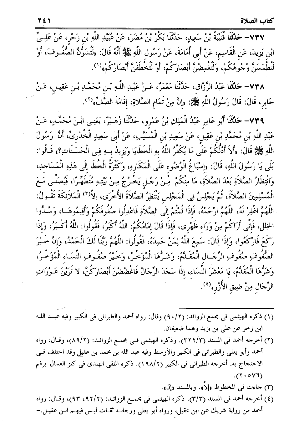 737 - حَدَّثَنَا قُتَيْبَةُ بْنُ سَعِيدٍ، حَدَّثَنَا بَكْرُ بْنُ مُضَرَ، عَنْ عُبَيْدِ اللَّهِ بْنِ زَحْرٍ، عَنْ عَلِىِّ ابْنِ يَزِيدَ، عَنِ الْقَاسِمِ، عَنْ أَبِى أُمَامَةَ، عَنْ رَسُولِ اللَّهِ صلى الله عليه وسلم أَنَّهُ قَالَ: "لَتُسَوُّنَّ الصُّفُوفَ، أَوْ لَتُطْمَسَنَّ وُجُوهُكُمْ، وَلَتُغْمِضُنَّ أَبْصَارَكُمْ، أَوْ لَتُخْطَفَنَّ أَبْصَارُكُمْ.