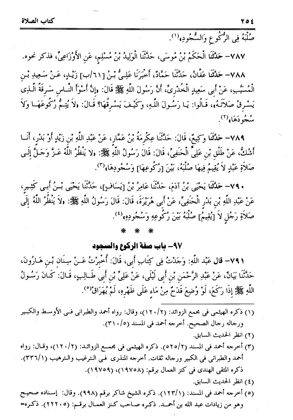 791 - قال عَبْد اللَّهِ: وَجَدْتُ فِى كِتَابِ أَبِى، قَالَ: أُخْبِرْتُ عَنْ سِنَانِ بْنِ هَارُونَ، حَدَّثَنَا بَيَانٌ، عَنْ عَبْدِ الرَّحْمَنِ بْنِ أَبِى لَيْلَى، عَنْ عَلِىِّ بْنِ أَبِى طَالِبٍ، قَالَ: كَانَ رَسُولُ اللَّهِ صلى الله عليه وسلم إِذَا رَكَعَ، لَوْ وُضِعَ قَدَحٌ مِنْ مَاءٍ عَلَى ظَهْرِهِ، لَمْ يُهَرَاقْ.
