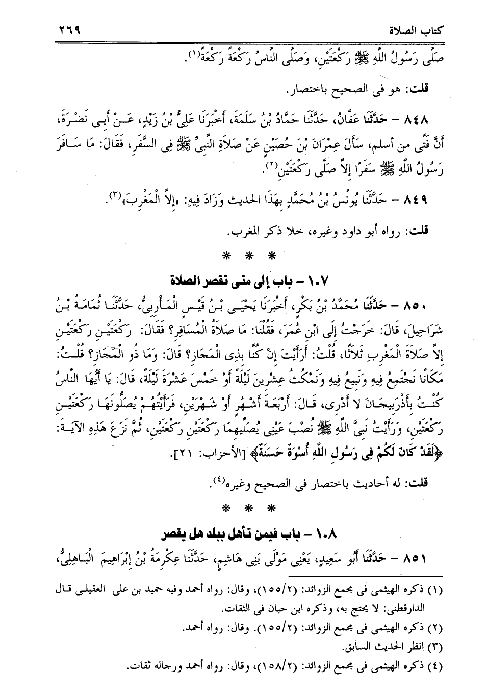 848 - حَدَّثَنَا عَفَّانُ، حَدَّثَنَا حَمَّادُ بْنُ سَلَمَةَ، أَخْبَرَنَا عَلِىُّ بْنُ زَيْدٍ، عَنْ أَبِى نَضْرَةَ، أَنَّ فَتًى من أسلم، سَأَلَ عِمْرَانَ بْنَ حُصَيْنٍ عَنْ صَلاَةِ النَّبِىِّ صلى الله عليه وسلم فِى السَّفَرِ، فَقَالَ: مَا سَافَرَ رَسُولُ اللَّهِ صلى الله عليه وسلم سَفَرًا إِلاَّ صَلَّى رَكْعَتَيْنِ.