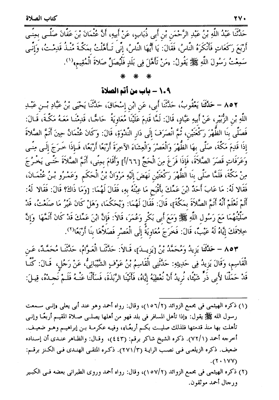 852 - حَدَّثَنَا يَعْقُوبُ، حَدَّثَنَا أَبِى، عَنِ ابْنِ إِسْحَاقَ، حَدَّثَنَا يَحْيَى بْنُ عَبَّادِ بْنِ عَبْدِ اللَّهِ بْنِ الزُّبَيْرِ، عَنْ أَبِيهِ عَبَّادٍ، قَالَ: لَمَّا قَدِمَ عَلَيْنَا مُعَاوِيَةُ حَاجًّا، قَدِمْنَا مَعَهُ مَكَّةَ، قَالَ: فَصَلَّى بِنَا الظُّهْرَ رَكْعَتَيْنِ، ثُمَّ انْصَرَفَ إِلَى دَارِ النَّدْوَةِ، قَالَ: وَكَانَ عُثْمَانُ حِينَ أَتَمَّ الصَّلاةَ إِذَا قَدِمَ مَكَّةَ، صَلَّى بِهَا الظُّهْرَ وَالْعَصْرَ وَالْعِشَاءَ الآخِرَةَ أَرْبَعًا أَرْبَعًا، فَإِذَا خَرَجَ إِلَى مِنًى وَعَرَفَاتٍ قَصَرَ الصَّلاَةَ، فَإِذَا فَرَغَ مِنَ الْحَجِّ وَأَقَامَ بِمِنًى، أَتَمَّ الصَّلاَةَ حَتَّى يَخْرُجَ مِنْ مَكَّةَ، فَلَمَّا صَلَّى بِنَا الظُّهْرَ رَكْعَتَيْنِ نَهَضَ إِلَيْهِ مَرْوَانُ بْنُ الْحَكَمِ وَعَمْرُو بْنُ عُثْمَانَ، فَقَالا لَهُ: مَا عَابَ أَحَدٌ ابْنَ عَمِّكَ بِأَقْبَحِ مَا عِبْتَهُ بِهِ، فَقَالَ لَهُمَا: [وَمَا ذَاكَ؟ قَالَ: فَقَالا لَهُ: أَلَمْ تَعْلَمْ أَنَّهُ أَتَمَّ الصَّلاَةَ بِمَكَّةَ] ، قَالَ: فَقَالَ لَهُمَا: وَيْحَكُمَا، وَهَلْ كَانَ غَيْرُ مَا صَنَعْتُ، قَدْ صَلَّيْتُهُمَا مَعَ رَسُولِ اللَّهِ صلى الله عليه وسلم وَمَعَ أَبِى بَكْرٍ وَعُمَرَ، قَالاَ: فَإِنَّ ابْنَ عَمِّكَ قَدْ كَانَ أَتَمَّهَا وَإِنَّ خِلافَكَ إِيَّاهُ لَهُ عَيْبٌ، قَالَ: فَخَرَجَ مُعَاوِيَةُ إِلَى الْعَصْرِ فَصَلاَّهَا بِنَا أَرْبَعًا.