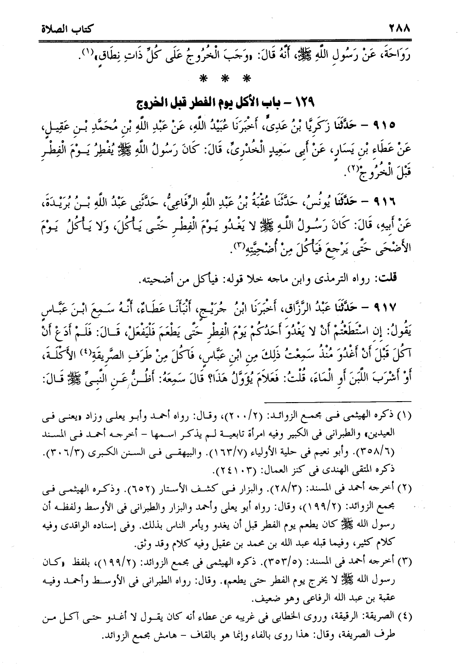 915 - حَدَّثَنَا زَكَرِيَّا بْنُ عَدِىٍّ، أَخْبَرَنَا عُبَيْدُ اللَّهِ، عَنْ عَبْدِ اللَّهِ بْنِ مُحَمَّدِ بْنِ عَقِيلٍ، عَنْ عَطَاءِ بْنِ يَسَارٍ، عَنْ أَبِى سَعِيدٍ الْخُدْرِىِّ، قَالَ: كَانَ رَسُولُ اللَّهِ صلى الله عليه وسلم يُفْطِرُ يَوْمَ الْفِطْرِ قَبْلَ الْخُرُوجْ.
