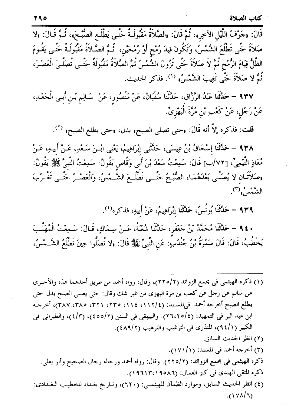938 - حَدَّثَنَا إِسْحَاقُ بْنُ عِيسَى، حَدَّثَنِى إِبْرَاهِيمُ، يَعْنِى ابْنَ سَعْدٍ، عَنْ أَبِيهِ، عَنْ مُعَاذٍ التَّيْمِىِّ، قَالَ: سَمِعْتُ سَعْدَ بْنَ أَبِى وَقَّاصٍ يَقُولُ: سَمِعْتُ النَّبِىَّ صلى الله عليه وسلم يَقُولُ: "صَلاَتَانِ لا يُصَلَّى بَعْدَهُمَا، الصُّبْحُ حَتَّى تَطْلُعَ الشَّمْسُ، وَالْعَصْرُ حَتَّى تَغْرُبَ الشَّمْسُ.